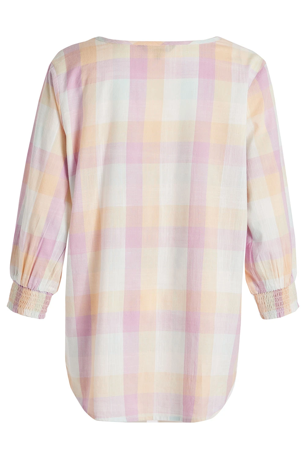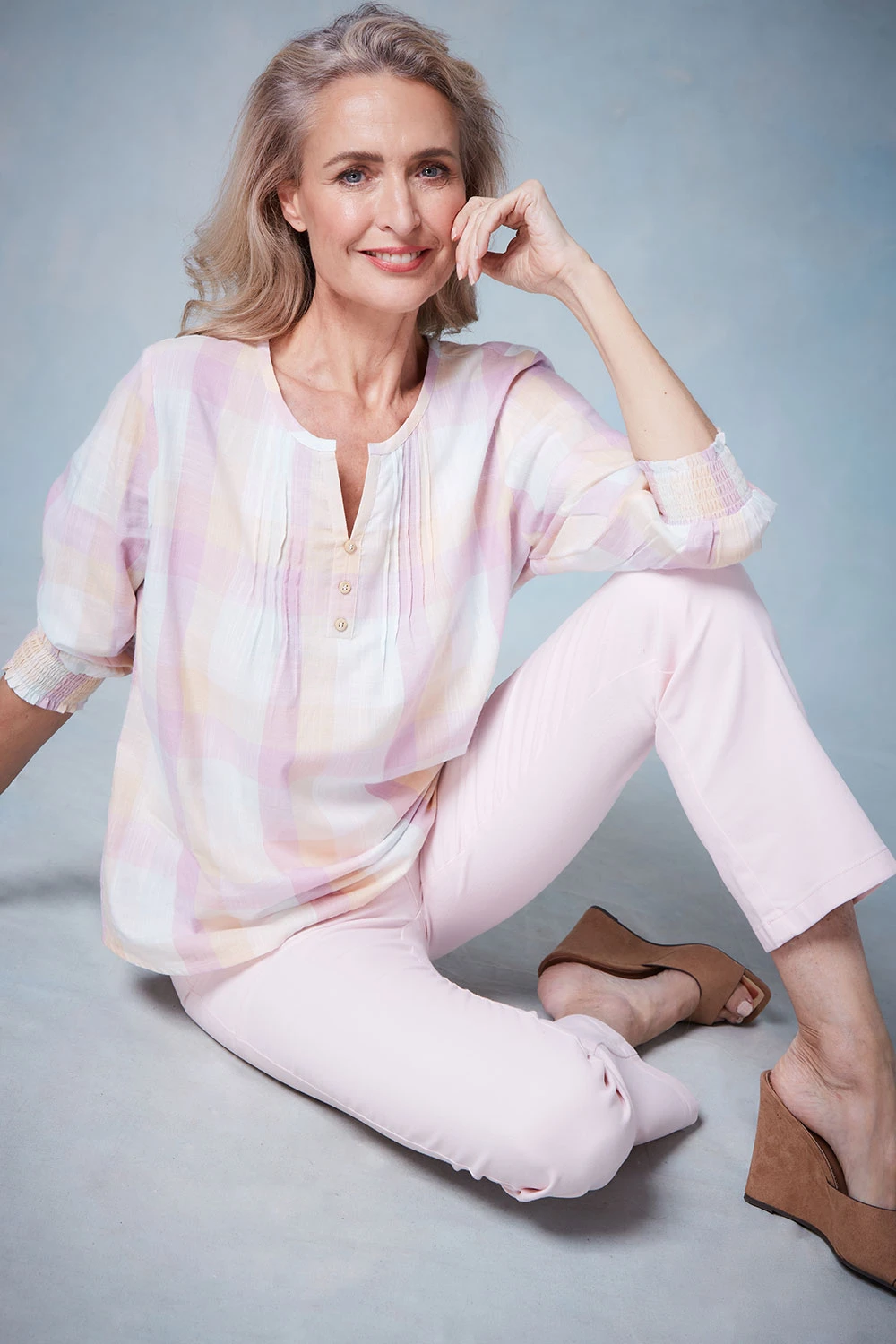 Add this pintuck multi-coloured check shirt to your collection this Spring. The pull over design makes it versatile and easy to wear. Paired with a notch neck and 3/4 sleeve for added comfort. Pair with jeggings and boots for a casual weekend look.