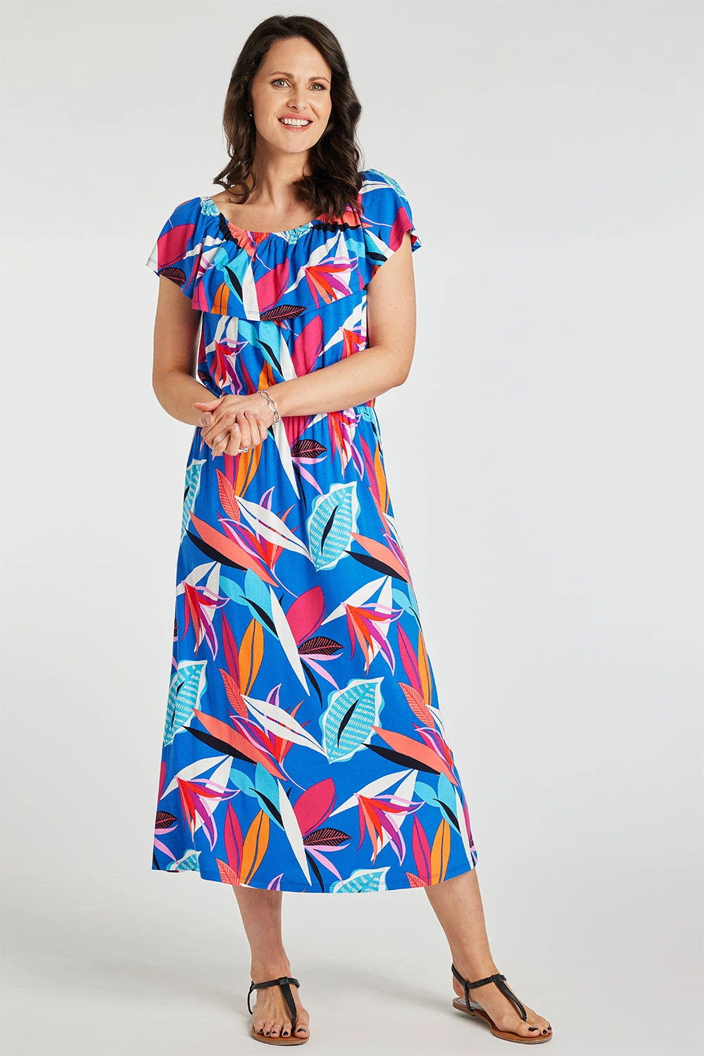 Get ready for Summer with this beautifully designed abstract jungle print dress. Complete with short sleeves and a bardot neckline to keep you stylish and cool in the warmer months. Pair with a light denim jacket and sandals for a great holiday look.