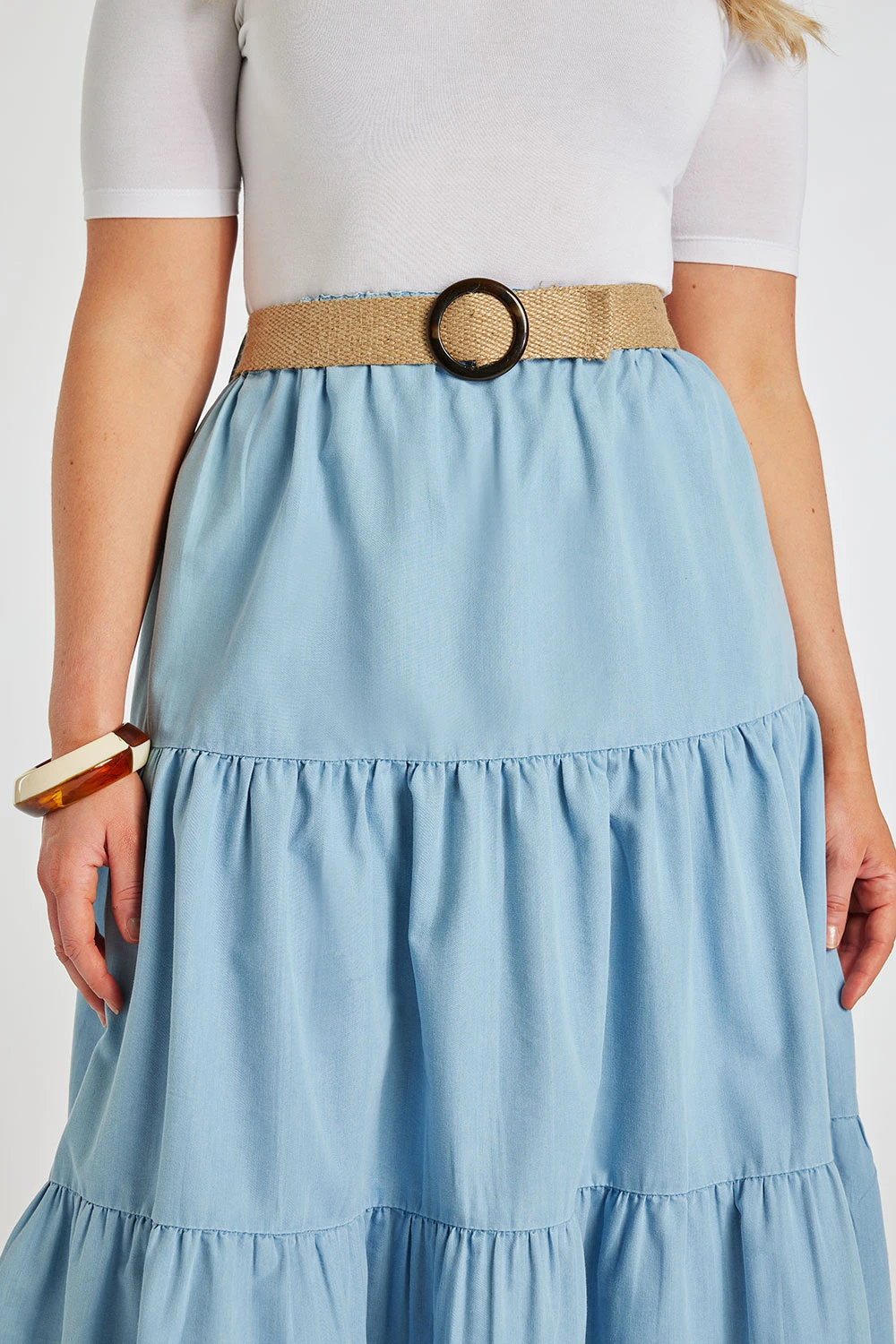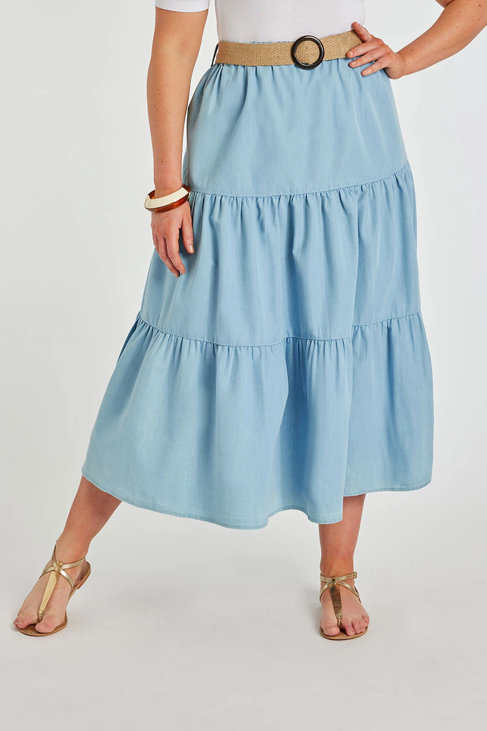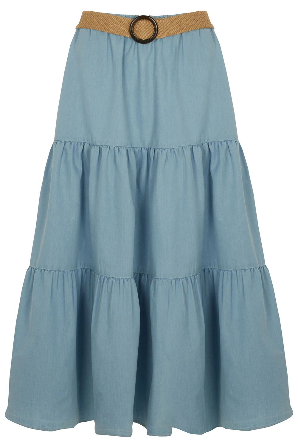 AUTONOMY | Complete your summer wardrobe with this lovely tiered skirt in a chambray fabric with belt detail. The flattering loose shape skims over your figure and the elasticated waist makes it easy to pull on plus adds an extra level of comfort. Featuring a lightweight fabric this skirt is perfect for keeping you cool on warm days. Style with a t-shirt and sandals or pumps for an easy to wear outfit.