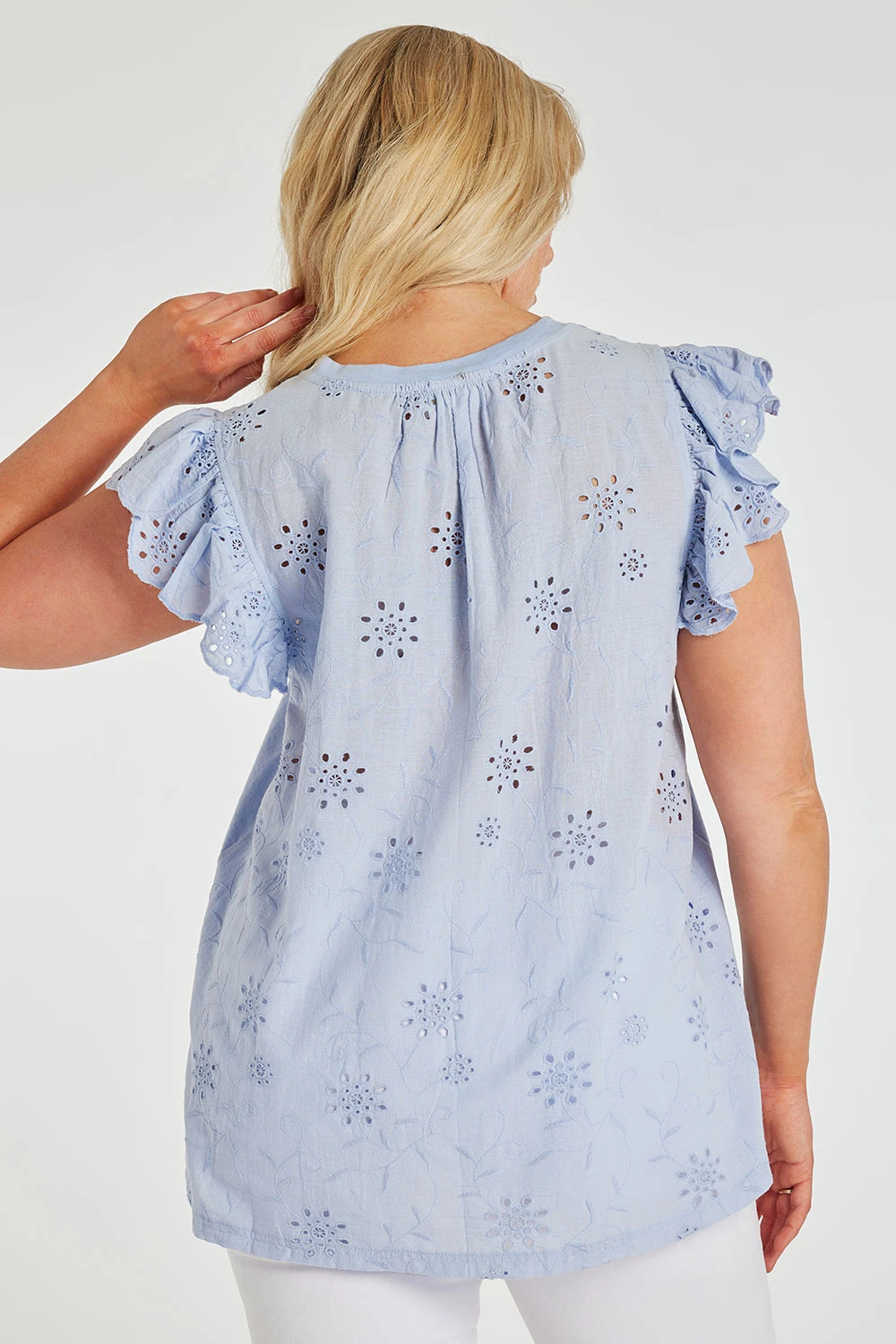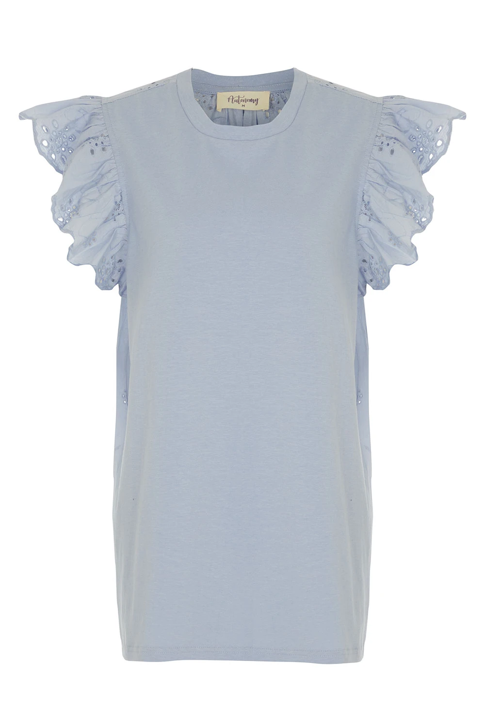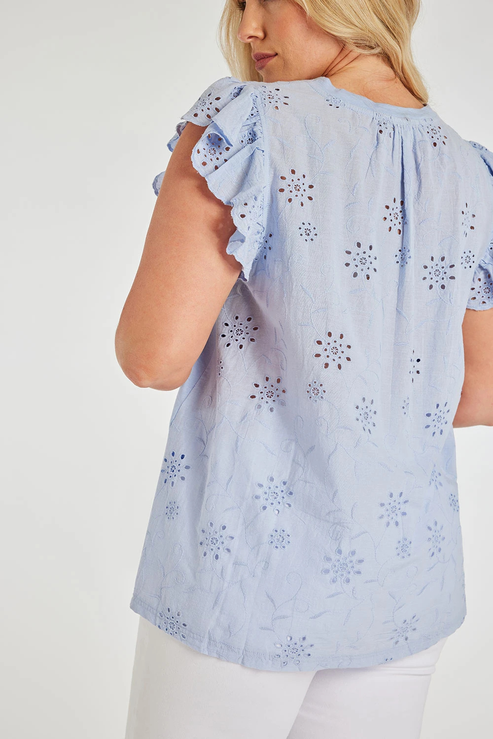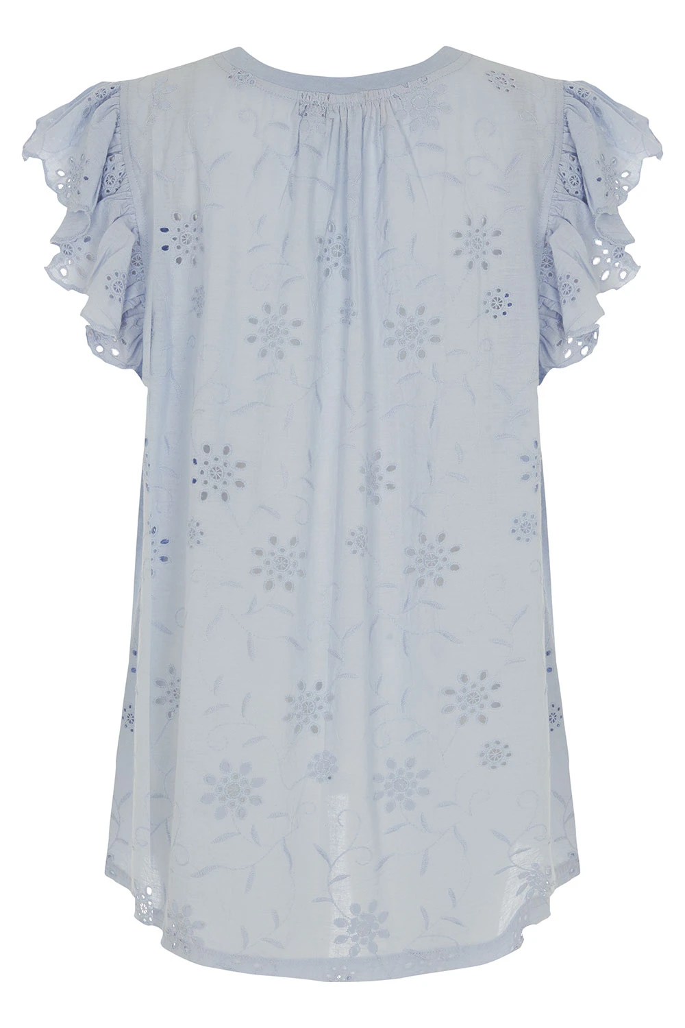 AUTONOMY | This short sleeve broderie t-shirt is perfect for your Spring wardrobe. The textured fabric on the front paired with short frill sleeves makes it easy to style with other things you may already have in your wardrobe.