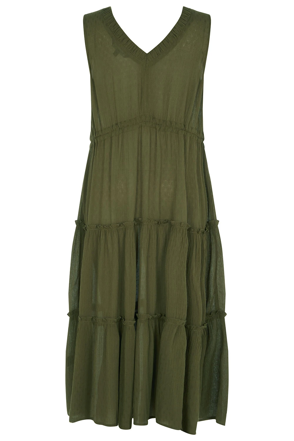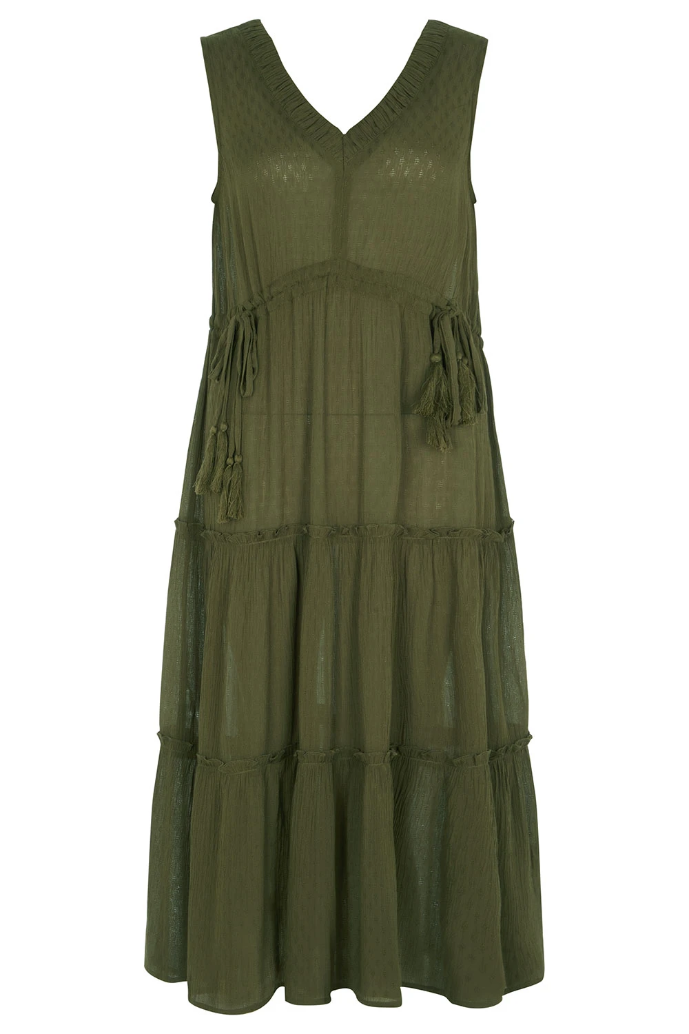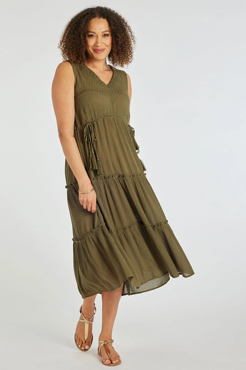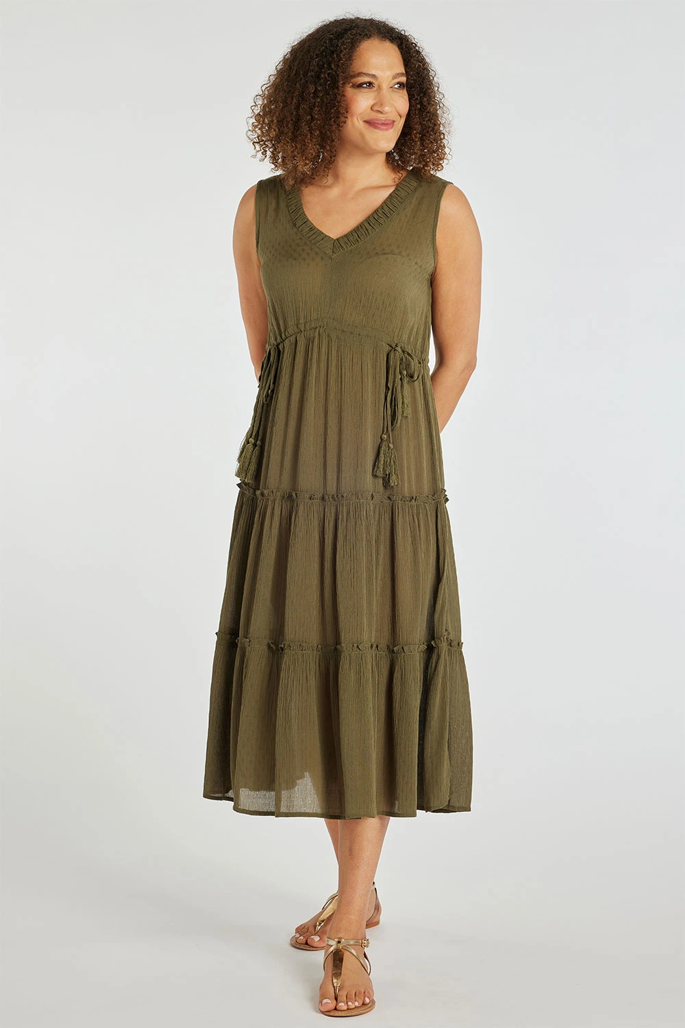 Add a flattering dress to your collection this season. In a plain tiered look with tie detailing, a modern v-neckline, and finished with floaty material for the perfect fit. This dress works great for a day-to-night outfit.