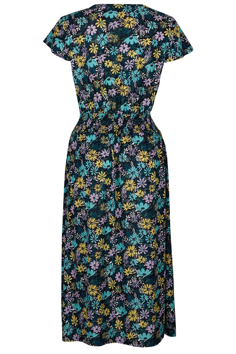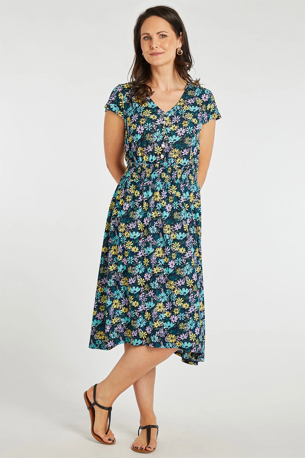 Stand out this season with this beautifully designed ditsy print dress. Complete with short sleeves and a v-neckline to keep you comfortable and fashionable this Summer. Pair with strappy sandals and a light jacket for the perfect Spring evening look.