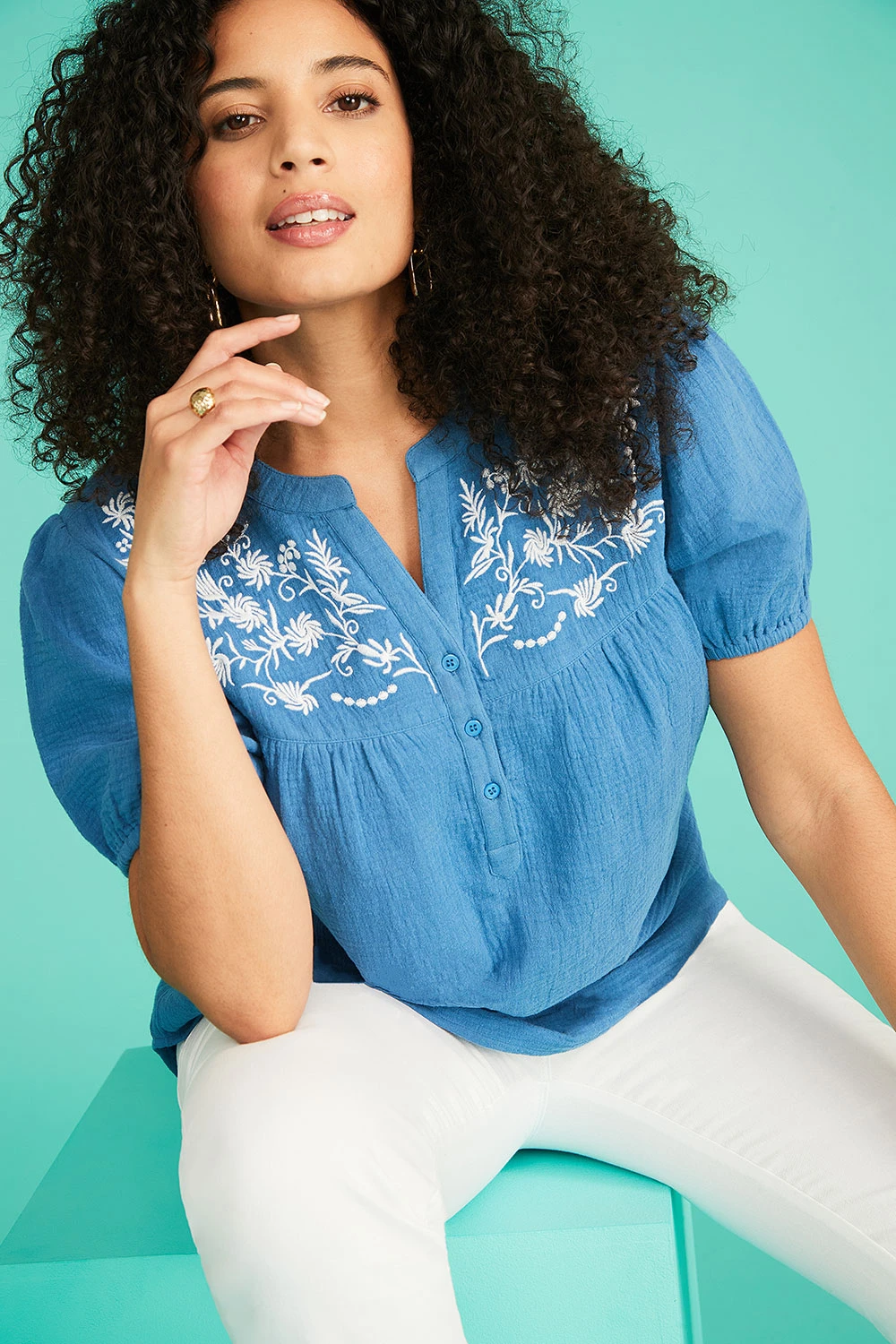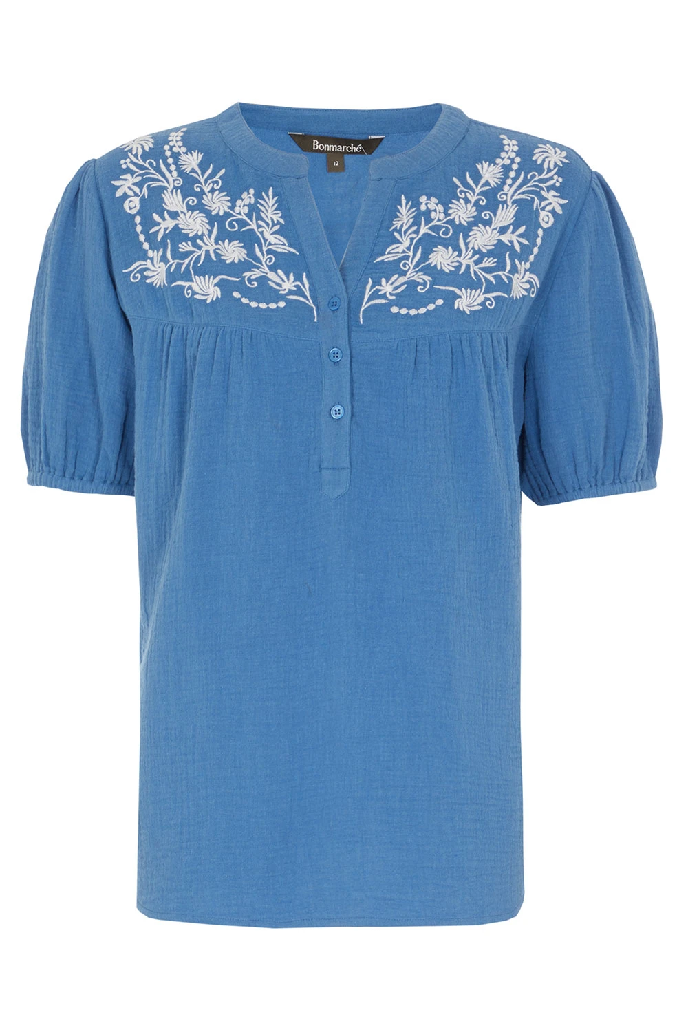 Get ready for casual Summer Sundays with this embroidered half placket shirt. Complete with short sleeves and a collarless design to keep you cool and stylish on warmer days. The embroidered pattern adds a feminine touch to the piece. Wear with linen trousers and boots for a great Summer look. And it is a part of the Lorraine Loves collection, chosen by Lorraine Kelly.