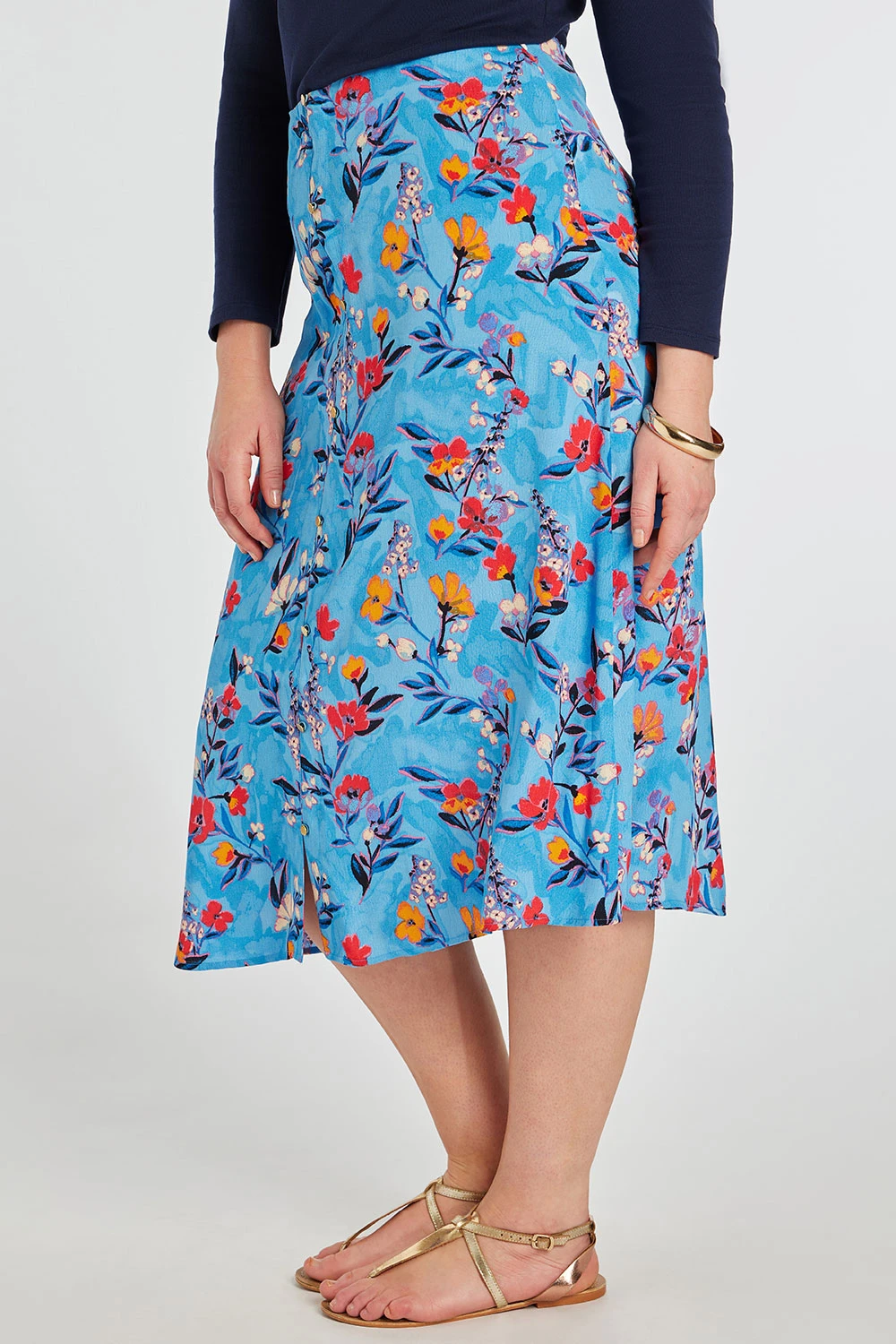 Stand out this Summer with this floral print skirt. It has non-functioning buttons down the front and a beautifully designed floral print. Pair with a white vest and sandals for a great holiday look.