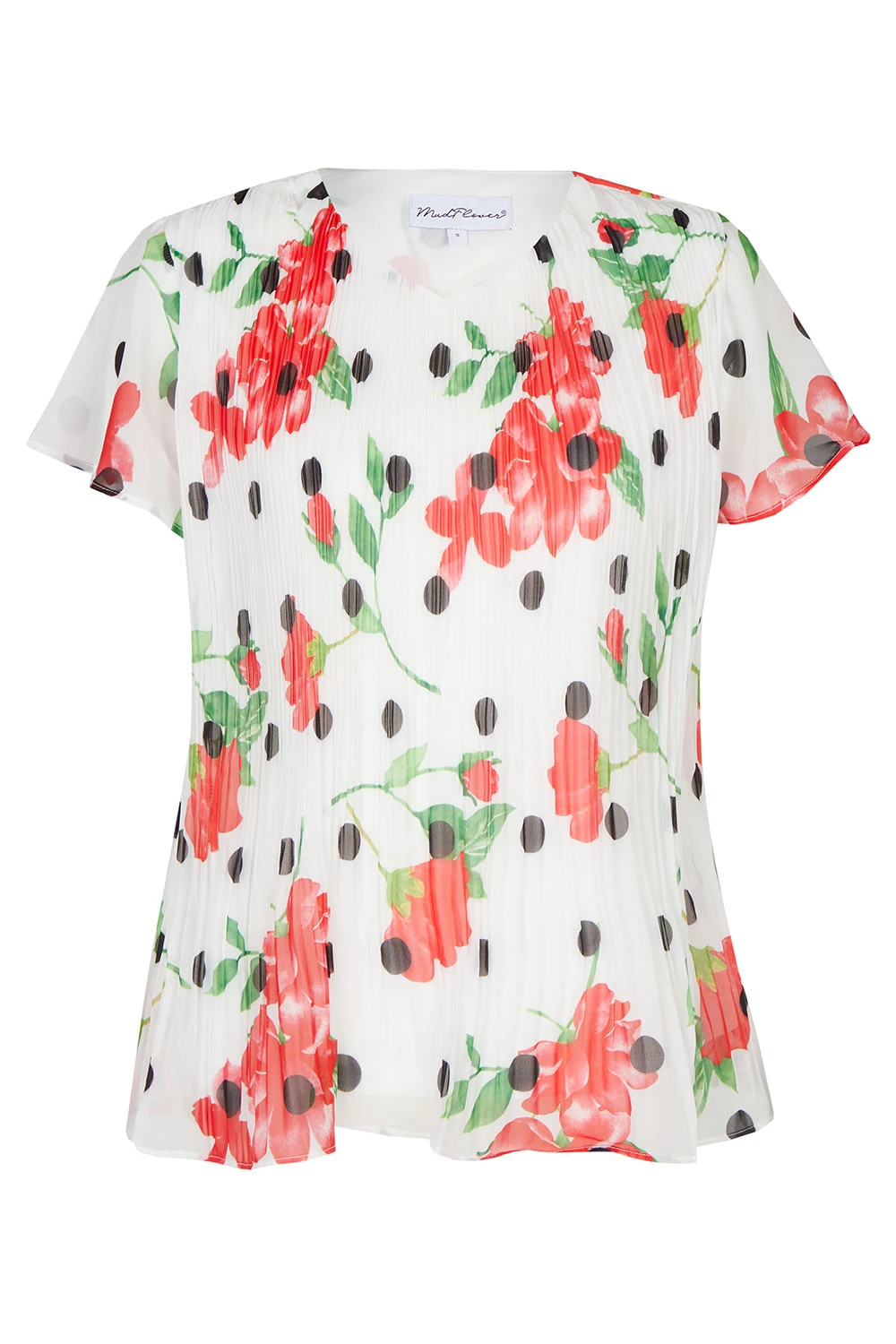 This short sleeve top features a bright floral print and a pretty, pleated design in a flattering fit. Wear it with your favourite black trousers and sparkly necklace.