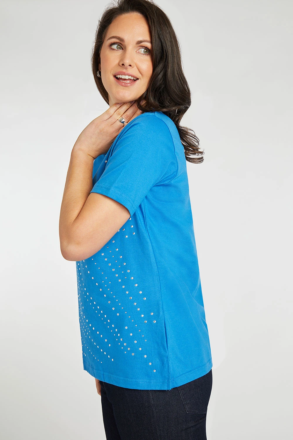 This t-shirt is perfect for summer. The pretty burst pattern with hotfix detailing is sure to become a favourite this season. Featuring short sleeves and a classic round neckline. Style with jeans for a casual daytime look.