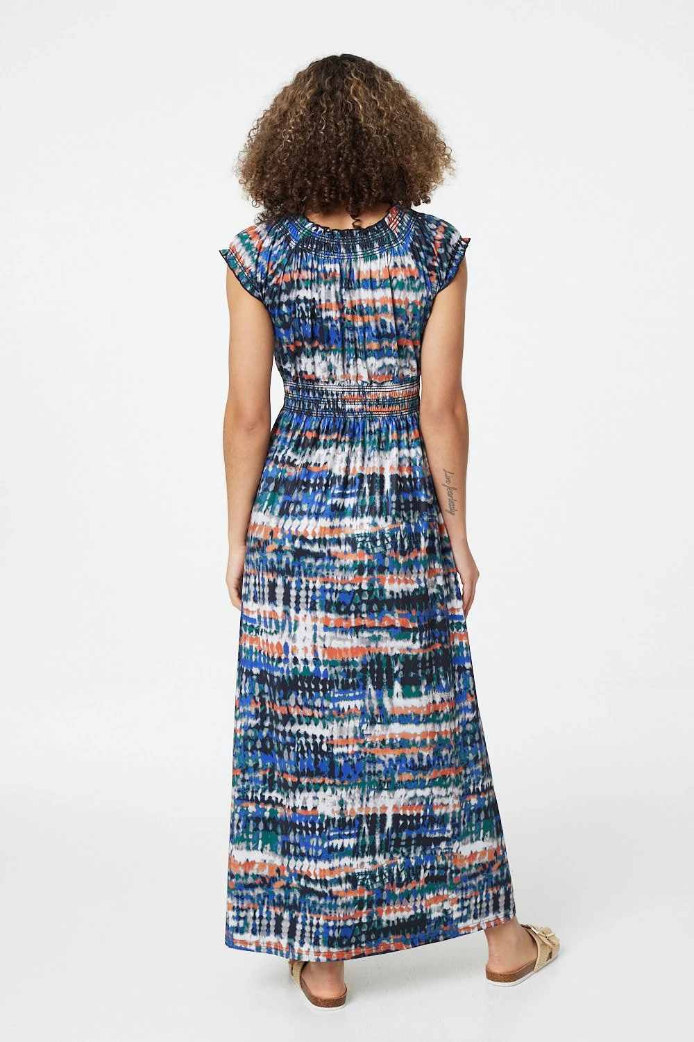 IZABEL LONDON | Add a versatile maxi dress to your wardrobe with this abstract print dress with an empire silhouette. Made from a soft jersey fabric, it has a v-neck with shirred detailing, short capped sleeves, a shirred waist and an a-line maxi length skirt. Pair with flat ballet pumps or sandals for a casual but stylish weekend look.