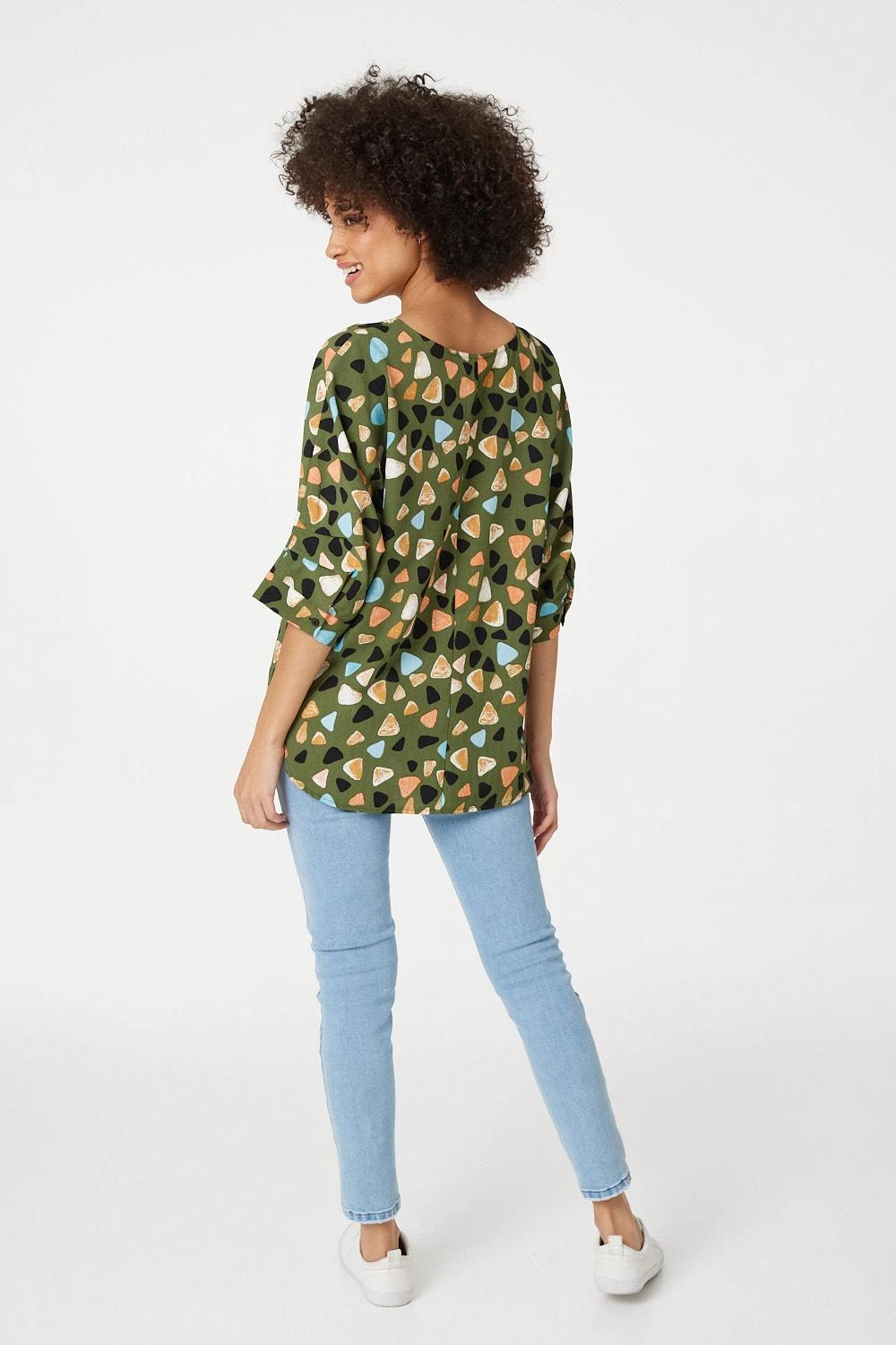 IZABEL LONDON | Add a vibrant abstract print to your wardrobe with this gathered sleeve detail blouse. It has a round neck, 3/4 sleeves, and a high low curved hem falling just below the hips. Pair with skinny jeans and fresh white trainers for an on trend weekend style.