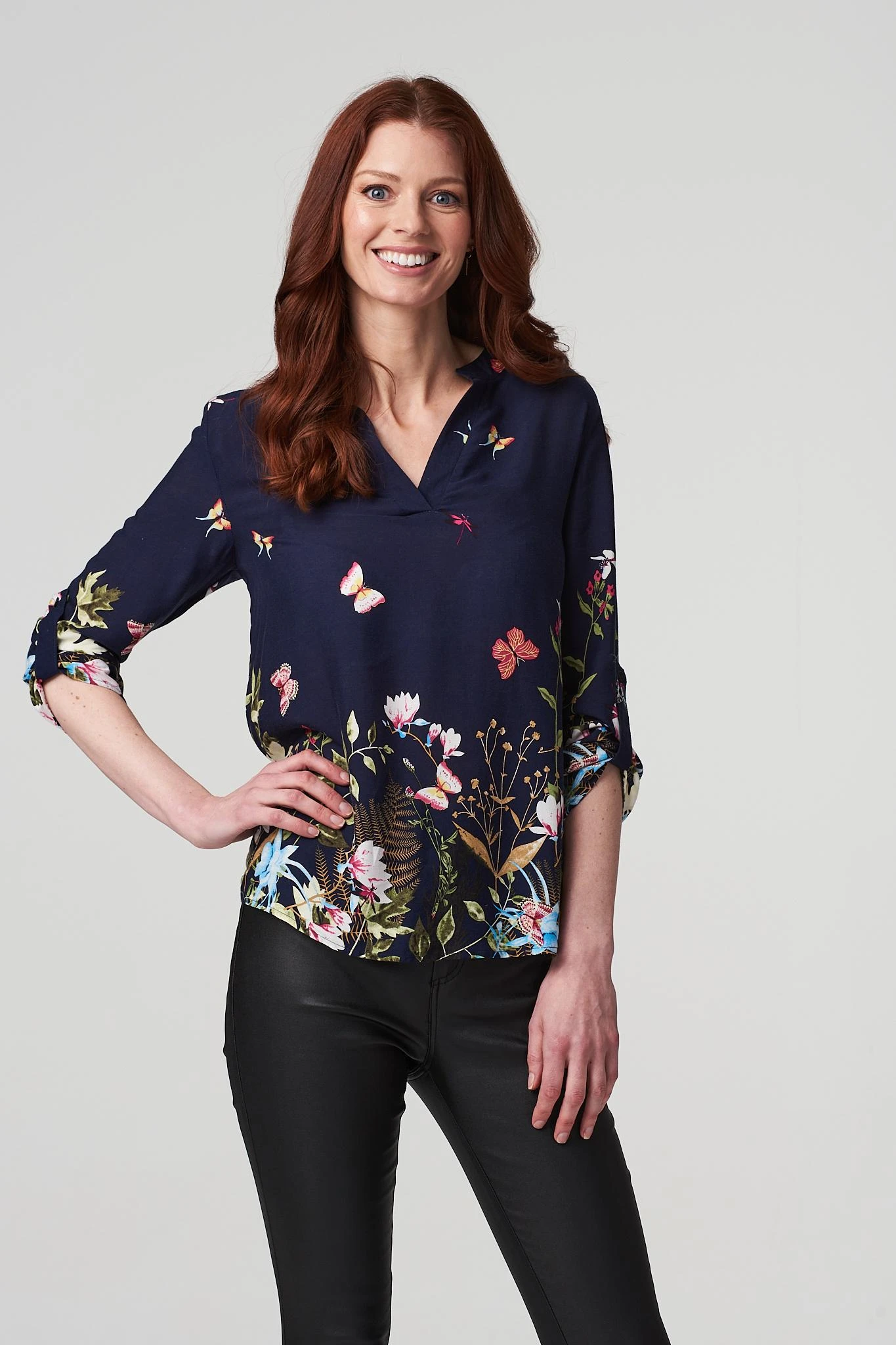 IZABEL LONDON | Add a new print to your workwear wardrobe with this floral and butterfly print shirt. It has a v-neck, long sleeves, and sits on the hips. Style with tailored trousers and low block heels for the office.