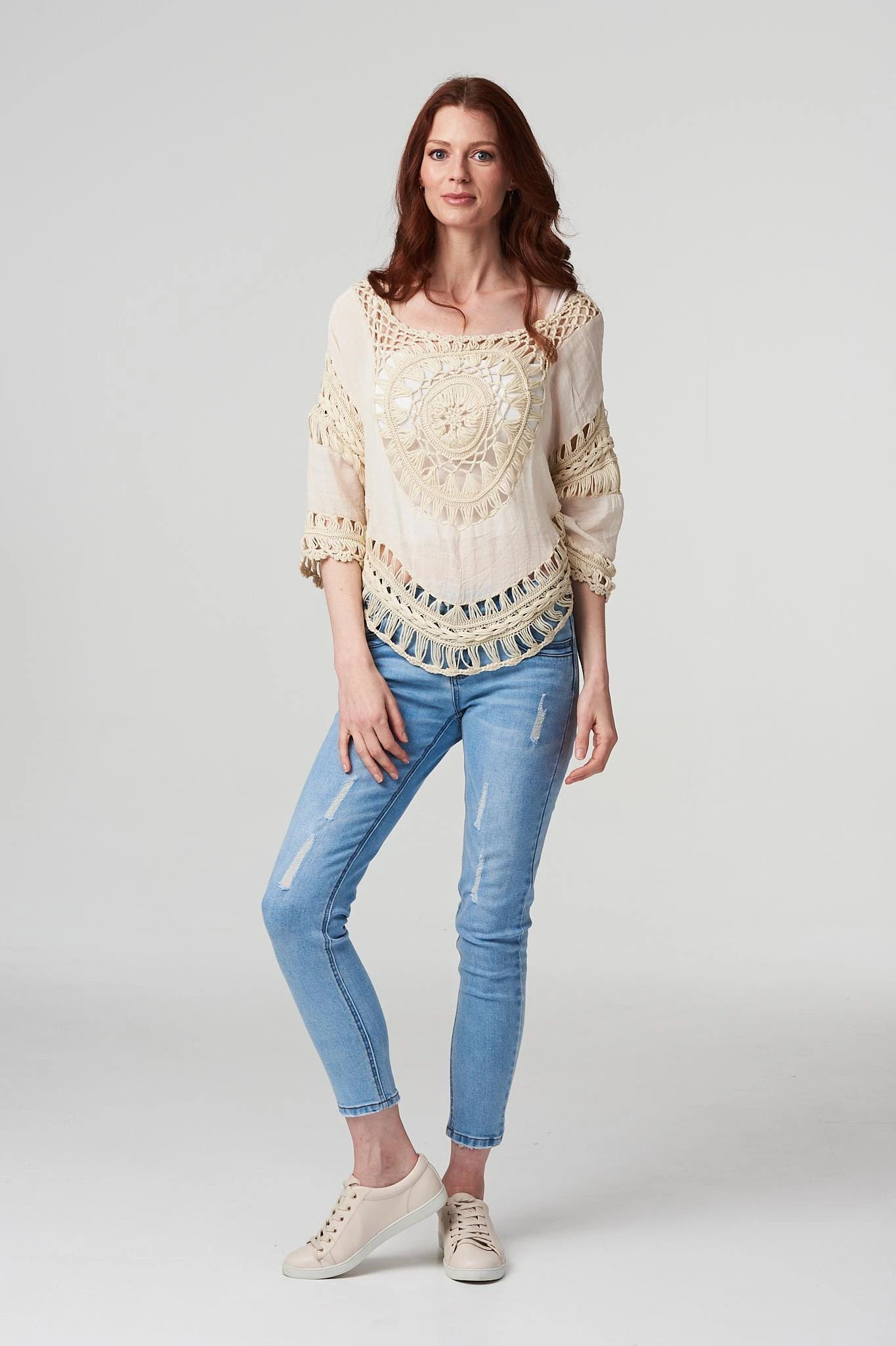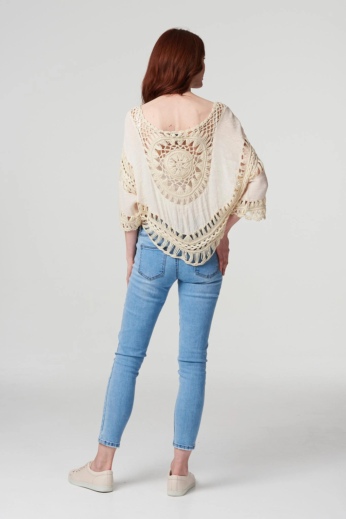 IZABEL LONDON | Every warm weather wardrobe needs a lightweight casual blouse like this relaxed fit crochet detail top. It has a square neck, 3/4 sleeves, and a hip length hem. Pair with cropped fitted trousers and heeled wedges for a statement off-duty style.