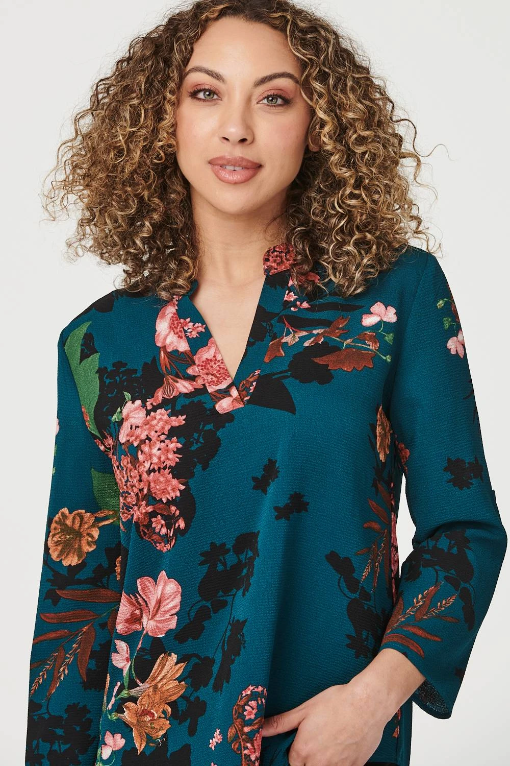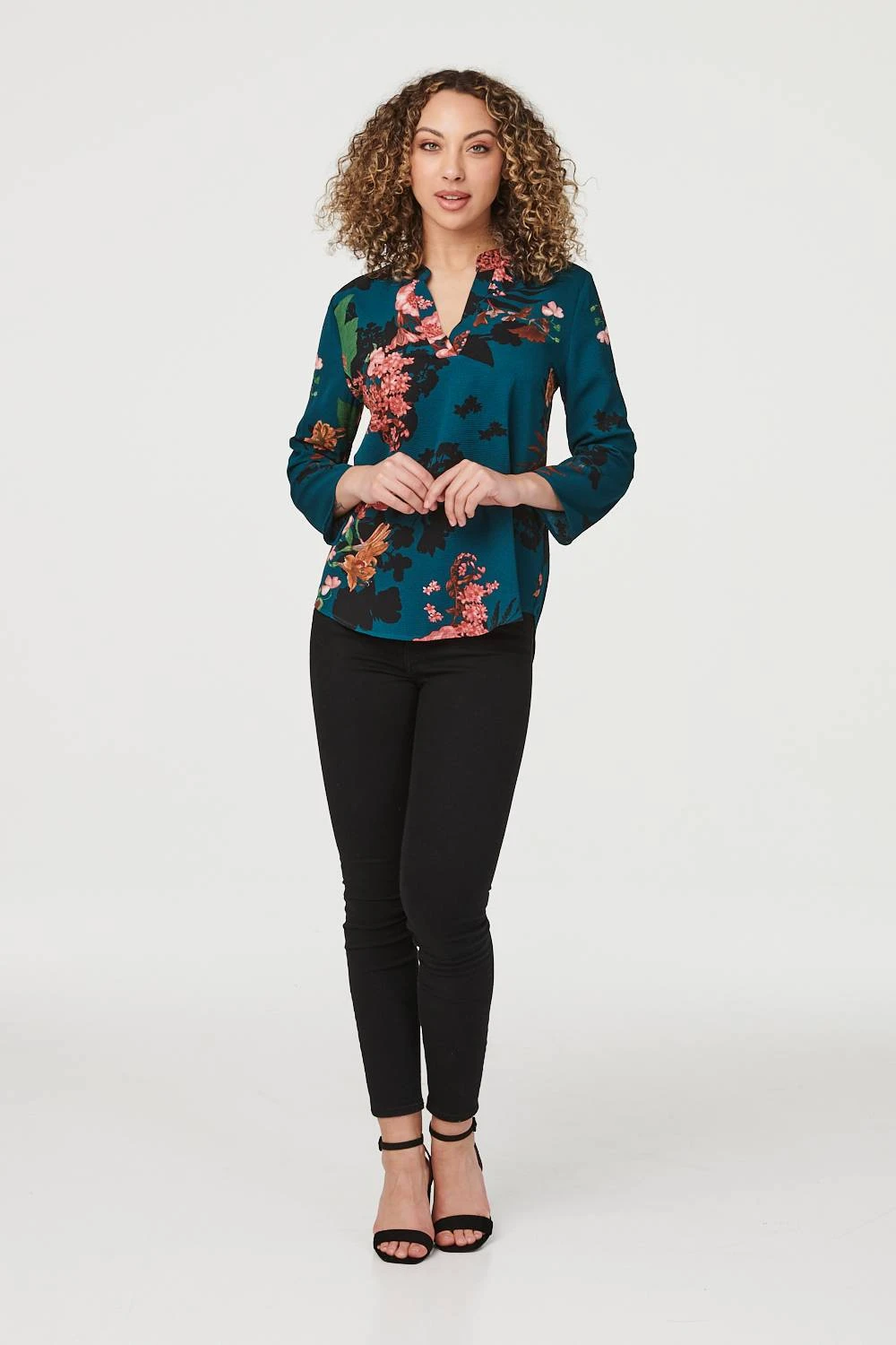 IZABEL LONDON | Make a bold statement in this floral collarless blouse. With a v-neck, 3/4 sleeves with a roll detail, and a high low hem. Style with jeans and heels for a girl’s night or pair with a faux leather pencil skirt and flats for the office.