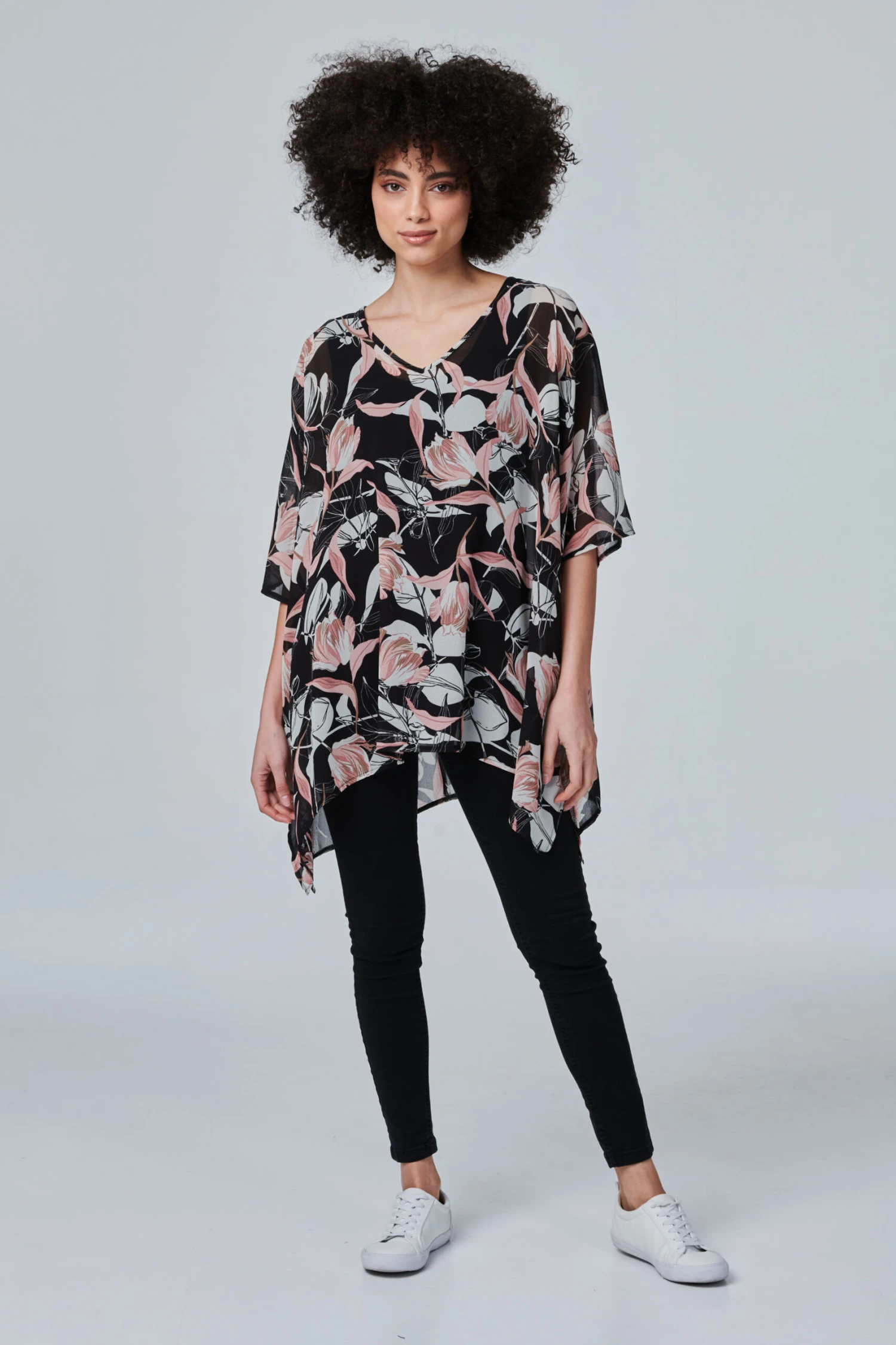 IZABEL LONDON | Add a bold floral print to your top collection with this floral oversized poncho top. It has a v-neck, flared 1/2 sleeves, side splits, and a floaty thigh-length hanky hemline. Team with leggings or skinny jeans for a comfortable warm weather style.