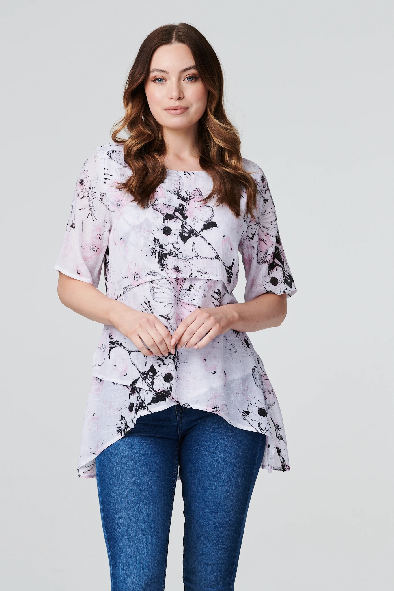 IZABEL LONDON | Add a delicate floral print to your weekend wardrobe with this short sleeve-layered top. It has a round neck, short sleeves, and a layered high-low hemline. Pair with skinny jeans and wedge heels for a pretty weekend style.