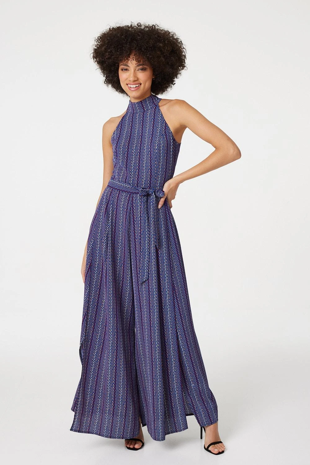 IZABEL LONDON | Swap your usual occasion dress for a glamorous jumpsuit like this one in a statement geo print. It has a halter neck, self tie waist, and a wide leg silhouette with front splits. Style with your favourite strappy heels to turn heads at any party.