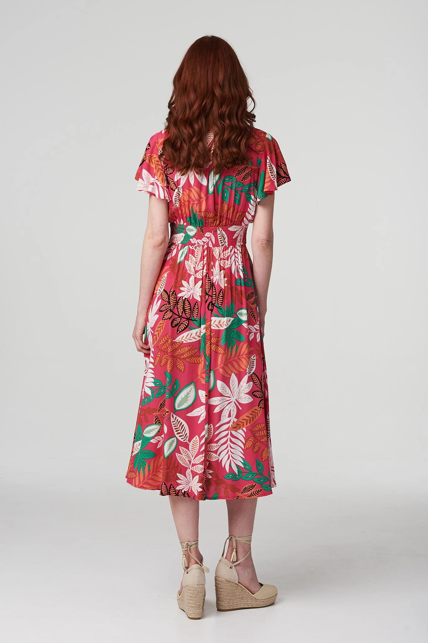 IZABEL LONDON | Add a vibrant print to your dress collection with this leaf printed midi. Made from 100% viscose, it has a v-neck, with a button front detail, short angel sleeves, a shirred waist, and a midi skirt. Team with espadrille wedges or flat sandals for a standout holiday style.
