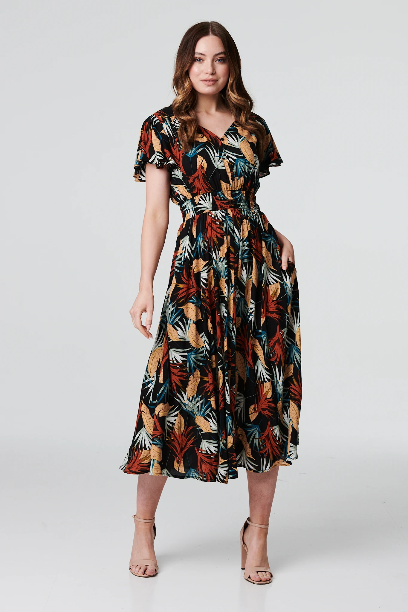 IZABEL LONDON | Add a vibrant leaf print to your wardrobe with this 100% viscose midi skater dress. It has a v-neck, button front, a shirred waist, pockets, short angel sleeves, and a midi-length skirt. Pair with neutral strappy heels for a chic warm weather style that’s great for an alfresco brunch with friends.