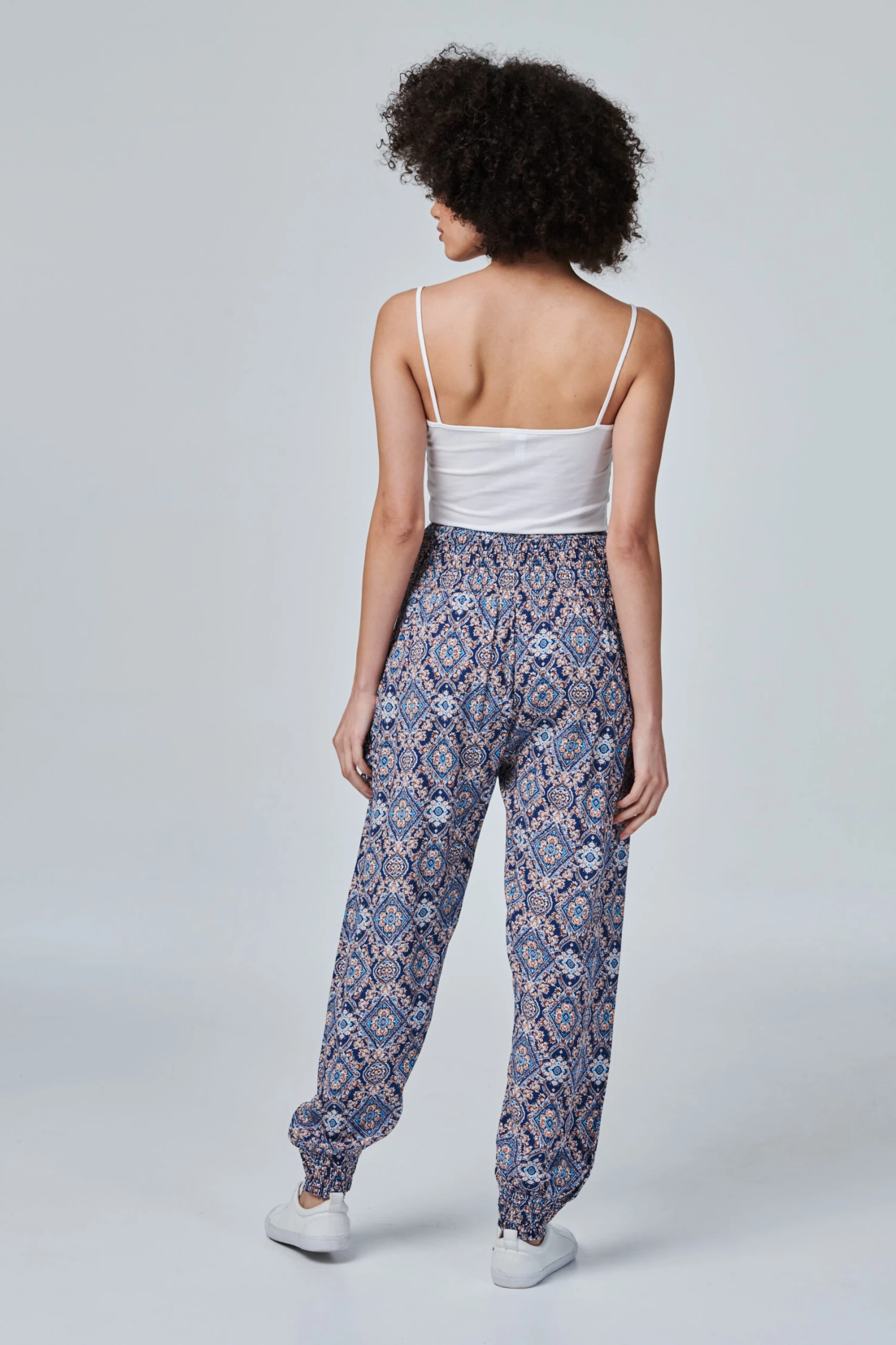 IZABEL LONDON | Add a statement print to your trouser collection with these mosaic print harem pants. Made from 100% viscose, they have a high rise waist, a shirred waistband, pockets with a self tie detail, shirred ankle cuffs, and tapered legs. Pair with a neutral top and sandals for a perfect addition to your warm weather wardrobe.