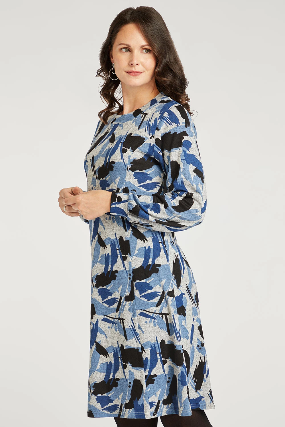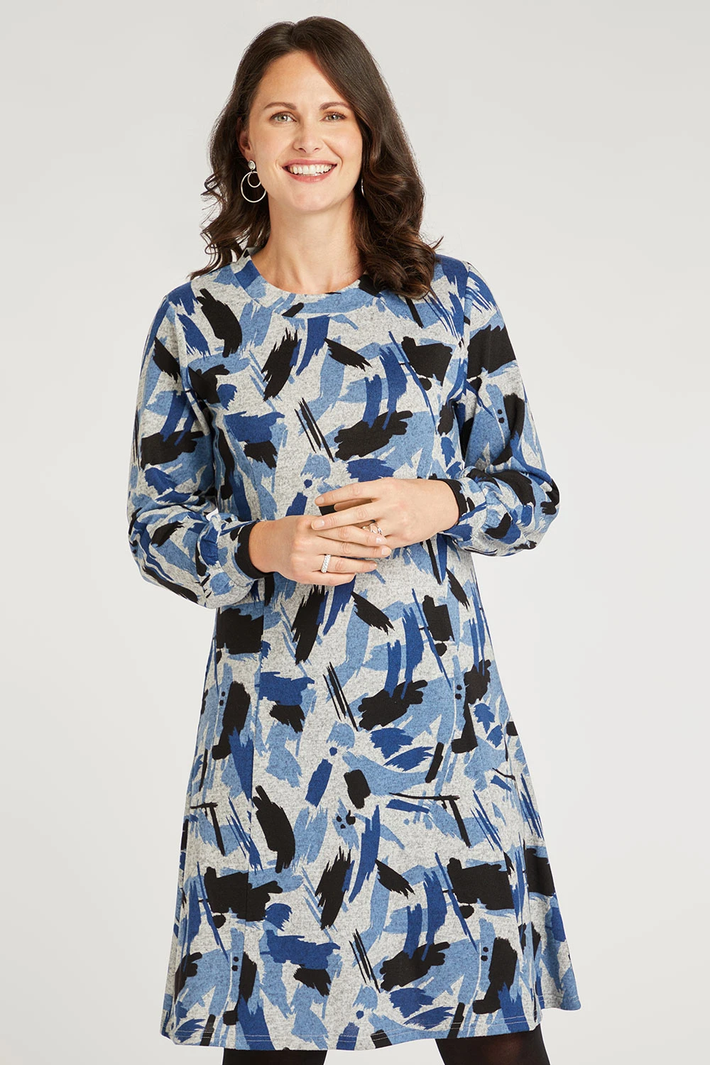 This season must-have! This soft touch dress with large dash print is one you’re sure to love. This stylish dress features long sleeves, soft touch fabric and comes in a swing style. Style with tights and boots for a winter outfit.