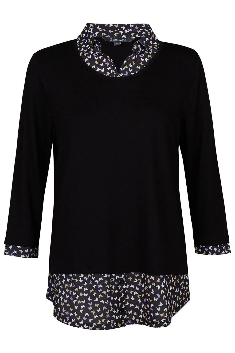 This contrast 2 in 1 top is perfect to dress up any outfit. The butterfly design and long sleeves make it comfortable and fashionable. Pair with jeans for a casual look or with a skirt and boots for a great office outfit.