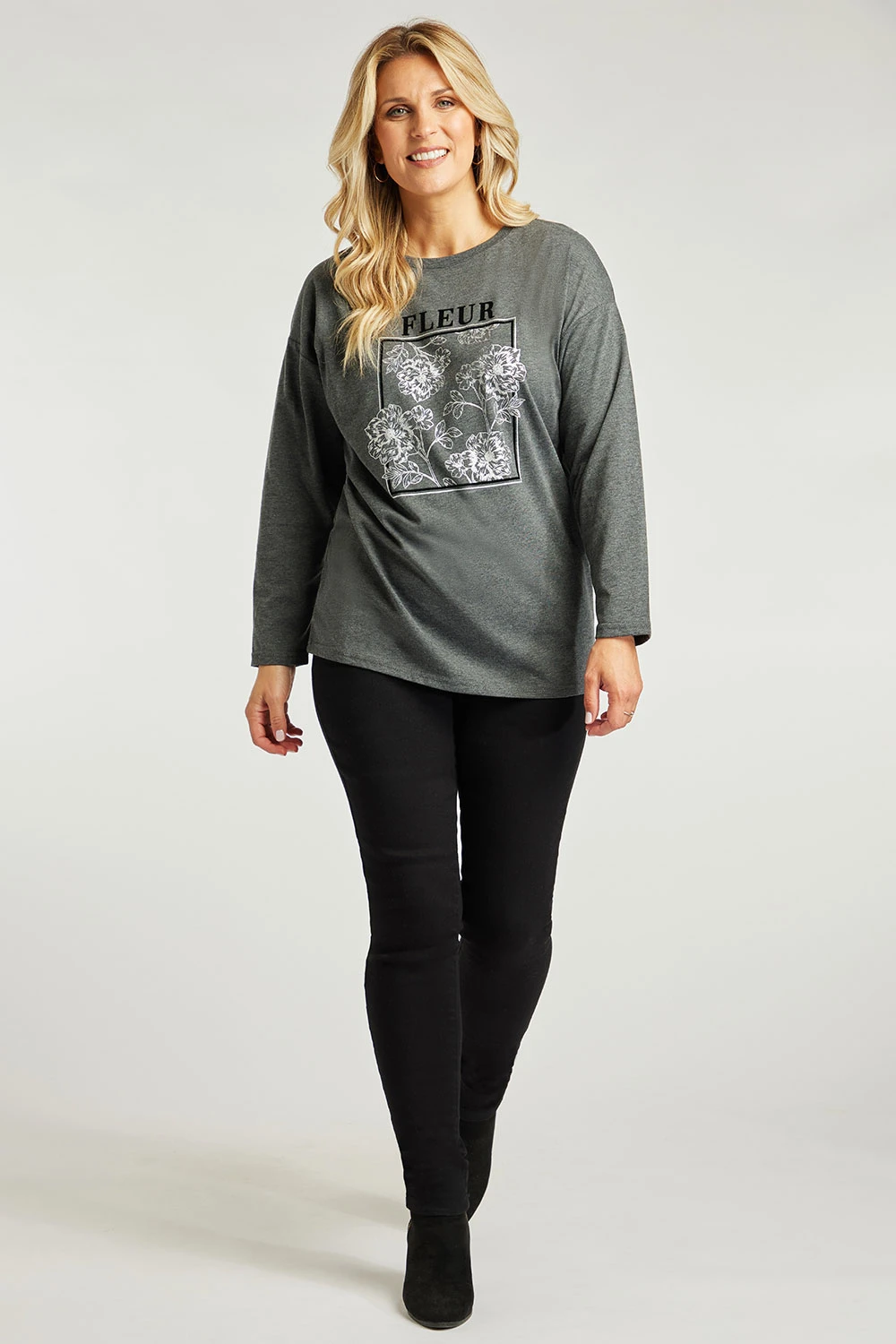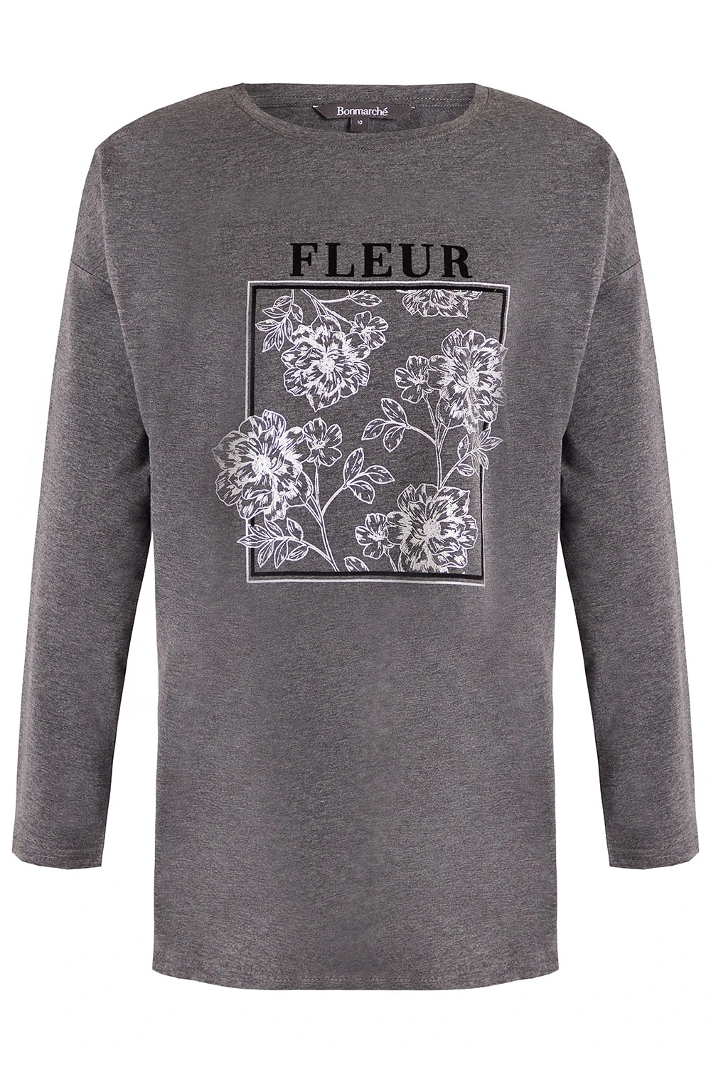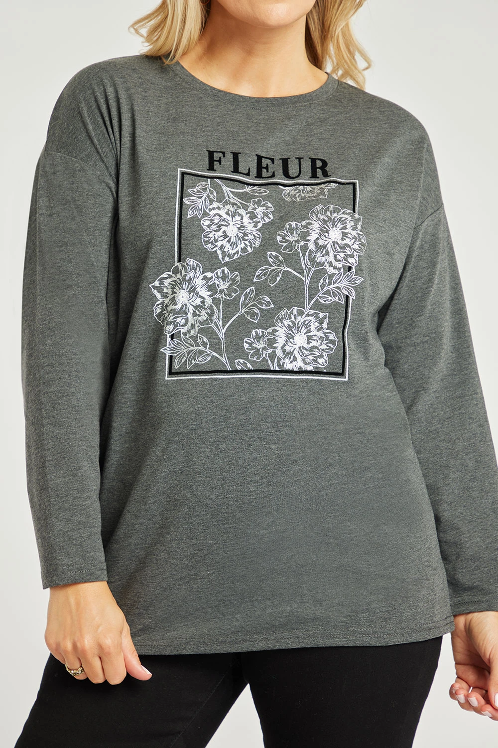 Relax in style with this fleur print top. The box flower design adds a feminine touch and the grey colour helps keep it casual and stylish. Pair with leggings and trainers for a cosy look.