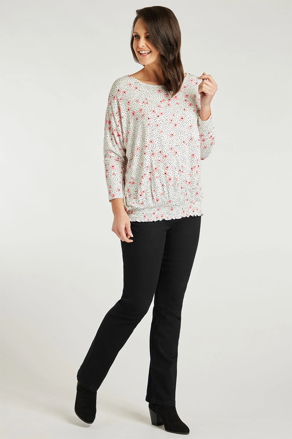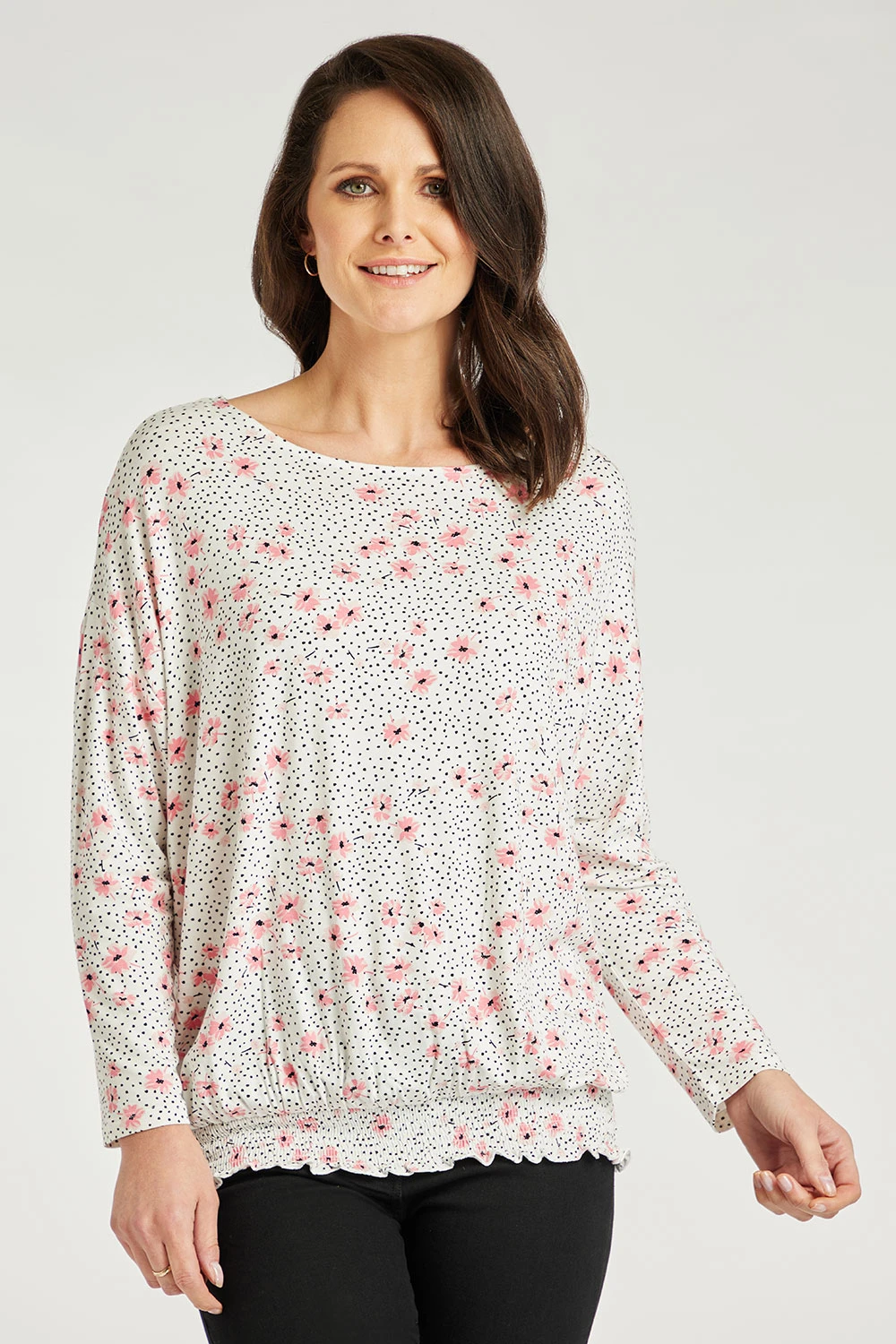 This beautifully designed ditsy floral top will be a great addition to any wardrobe. The long sleeves and round neck are great for seasonal change. The colour scheme and pattern add a feminine touch to the top. Pair with jeggings and boots for a smart casual look.