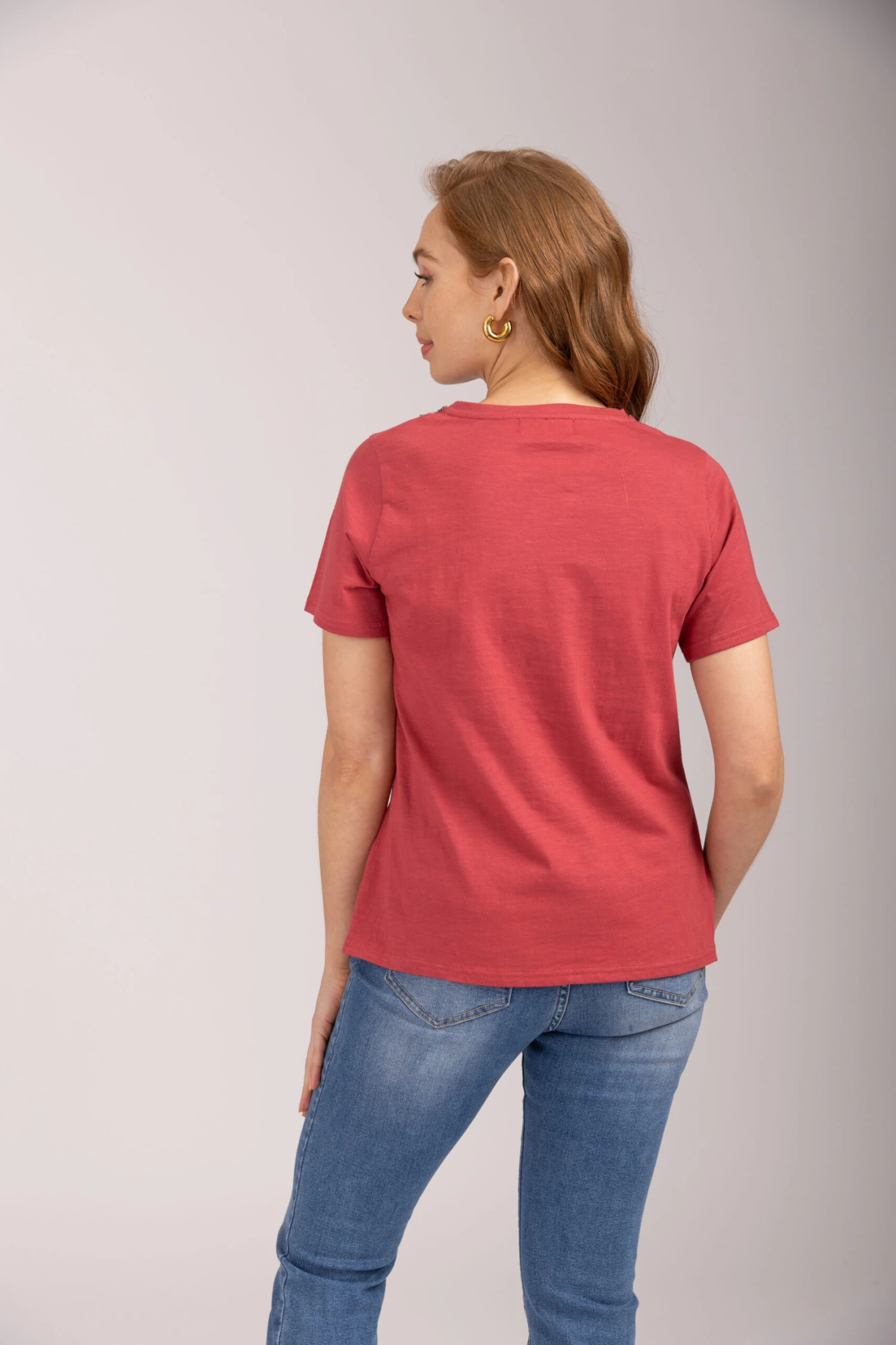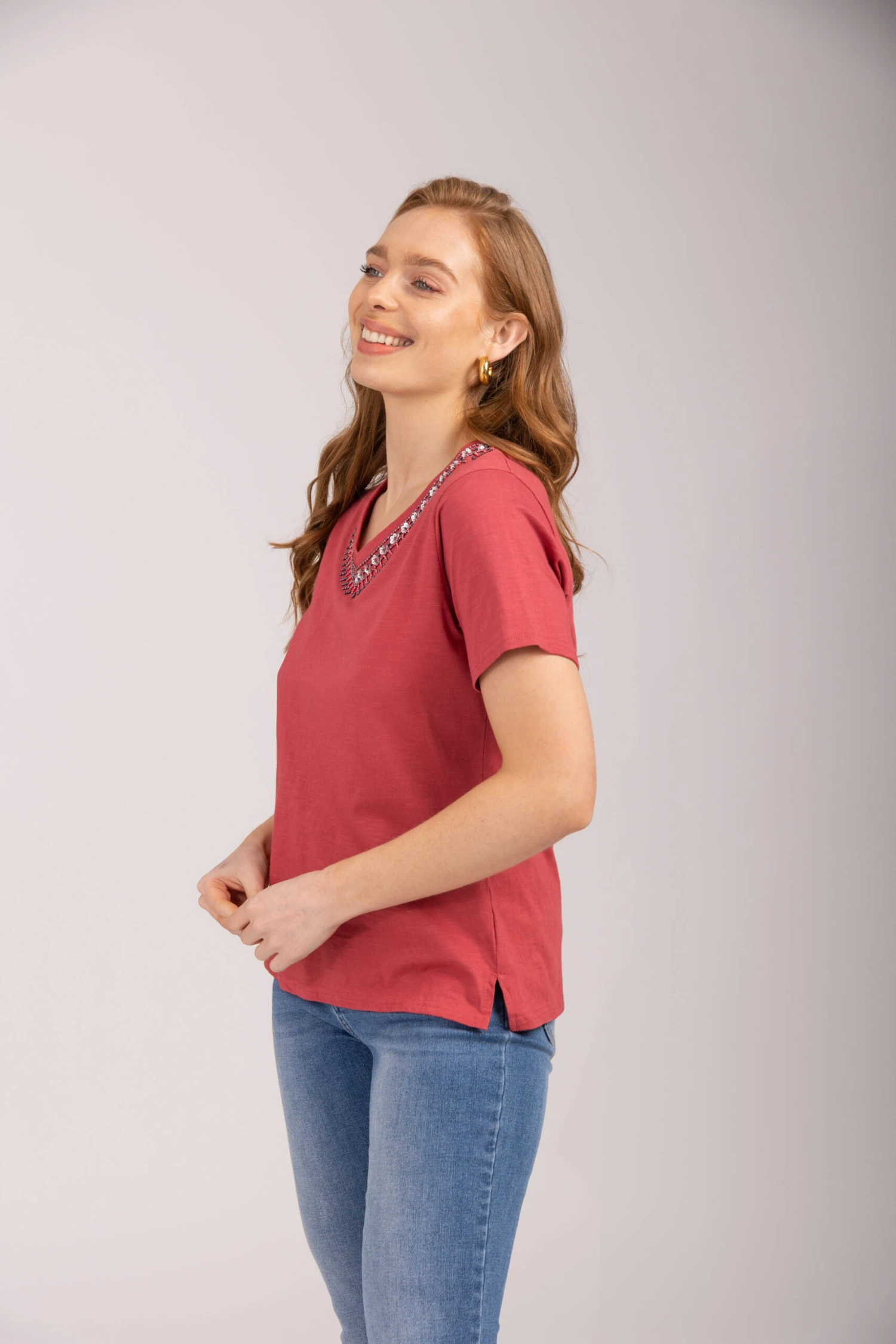MUDFLOWER | Our Embellished V-Neck T-Shirt is the perfect addition to your Spring wardrobe this year. Pull on this soft-touch t-shirt and stay cosy in style with its embellished design and V-neck neckline detail, and the detail will make you fit right in with the spring weather. We Style with Jeans and Jackets for the perfect Spring look.