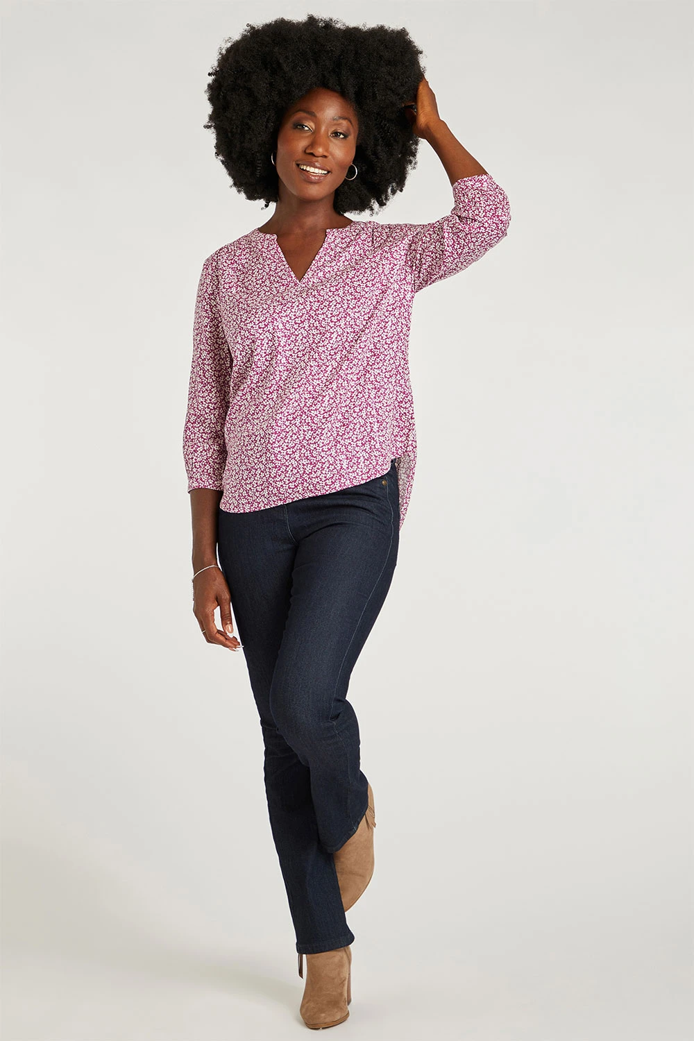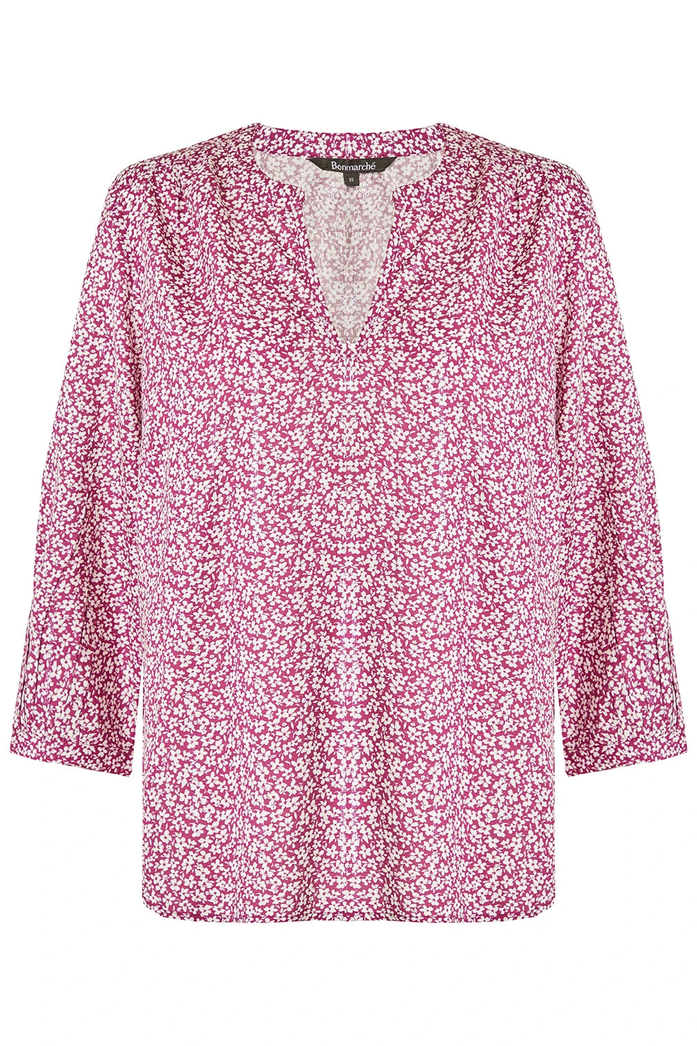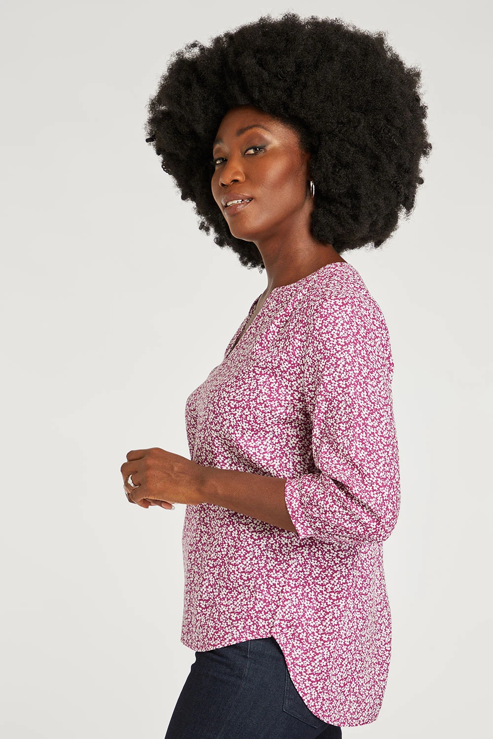 This pretty ditsy print blouse with a dipped hem and long sleeves will become a favourite in your wardrobe. Featuring, a flattering notch neck this overhead style shirt is easy to style, simply team it with your favourite jeans for a casual everyday look.