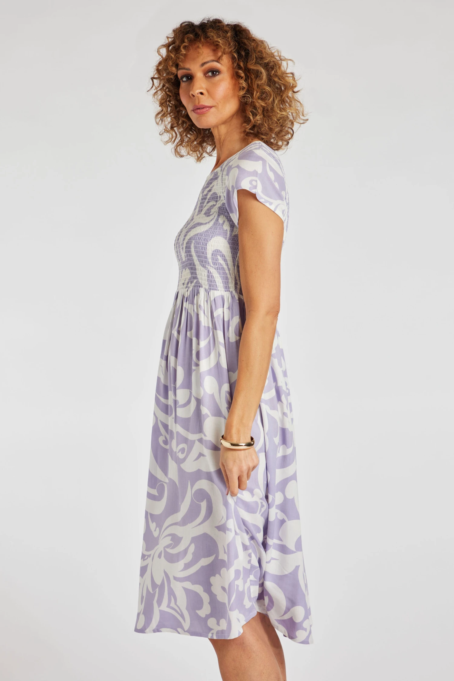 Swish your way through summer in this paisley sundress. With its subtle colour and shirred bodice, it is effortlessly feminine. The loose shape and lightweight fabric help to keep you cool on warm days, wear it with heels and a shawl at night or it’s perfect for a day at the park.
