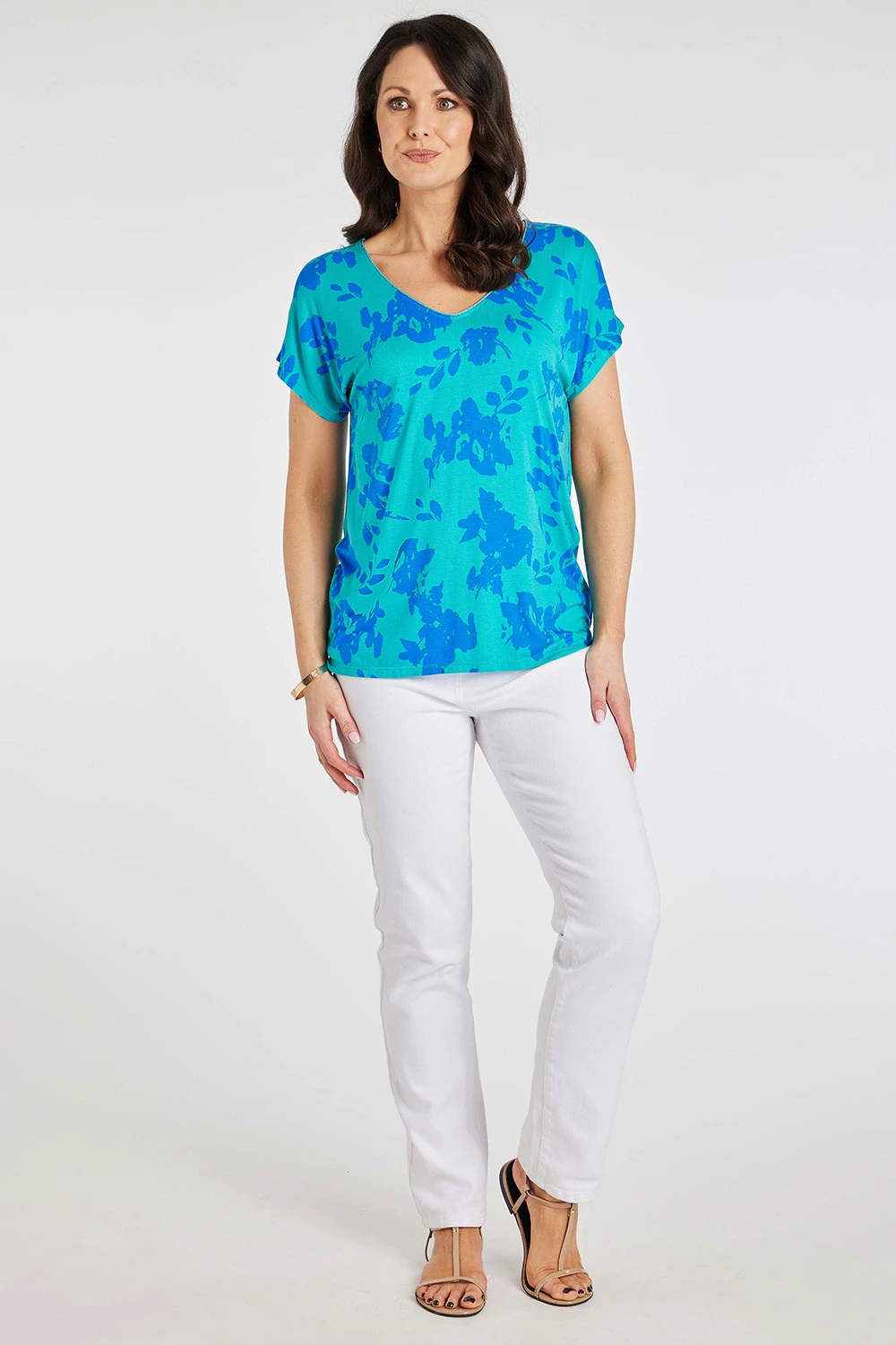 This stylish t-shirt features an abstract silhouette floral print. With its short sleeves, bold pattern, and delicate V-neckline, this piece will elevate your look. Simply style with jeans or cropped trousers.