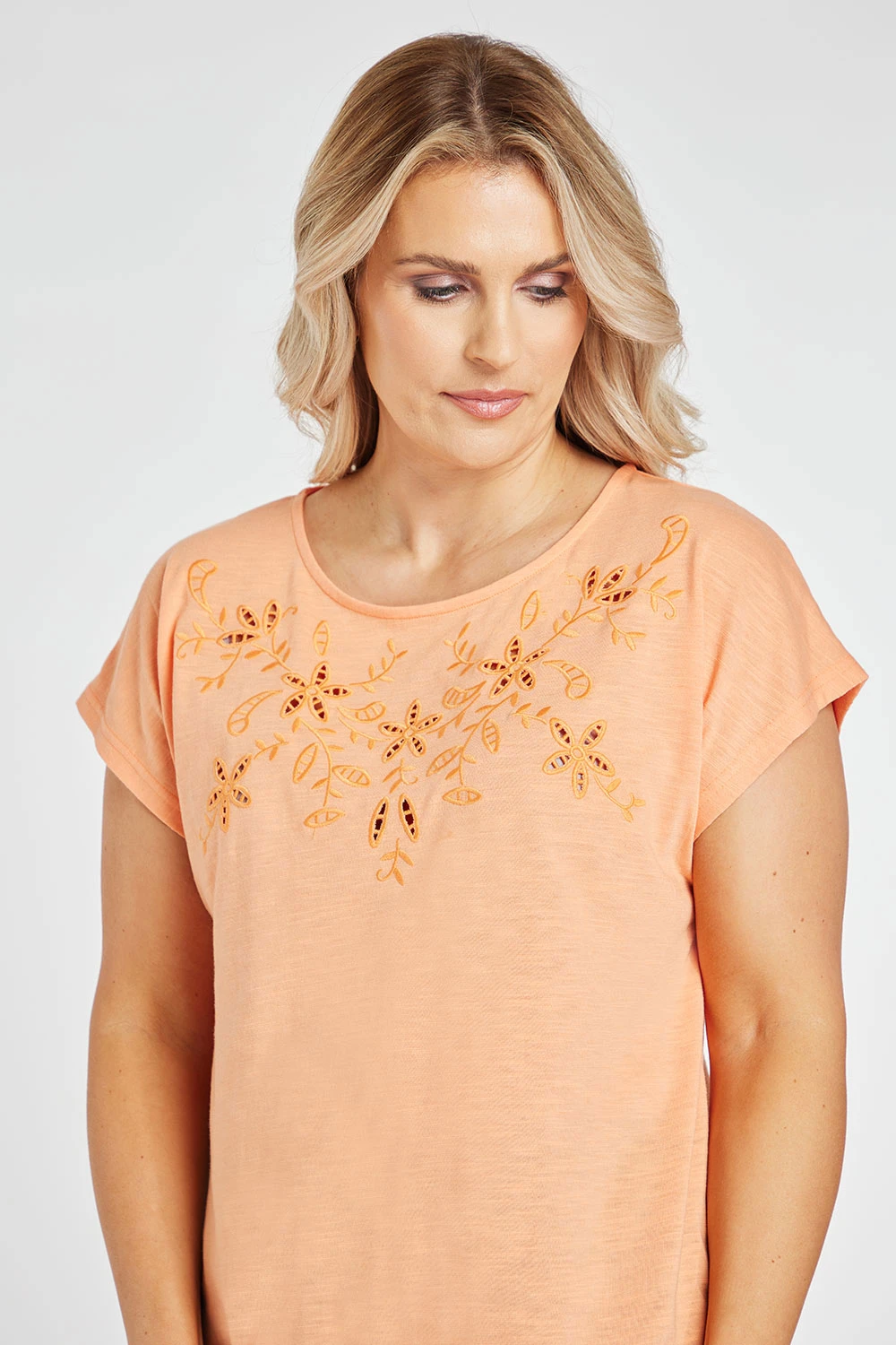 Add this broderie floral t-shirt to your collection this Spring. The beautifully designed floral embroidery paired with the bubble hem line makes it a must-have this season. It is easy to style and comfortable for the hotter weather.