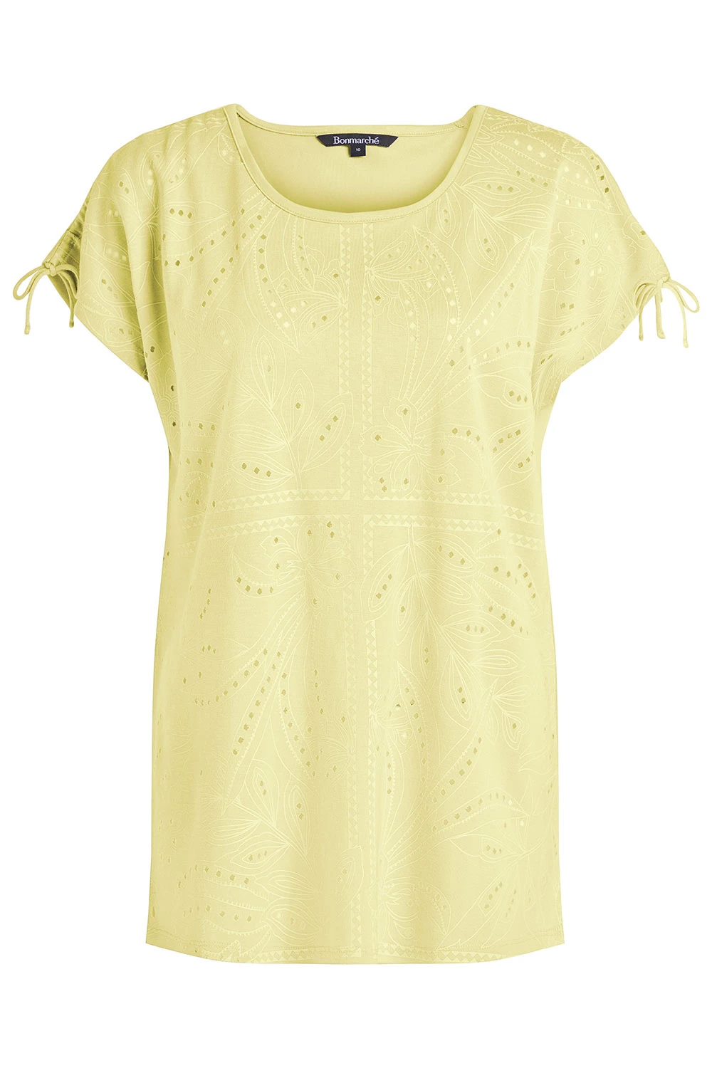 Swish into summertime in this beautifully designed burnout top. It is made from jersey stretch burnout fabric, with a soft velvety feel and floral texture over the geometric cutout shapes. It has a round neck and a short sleeve shape, ideal for warmer weather.