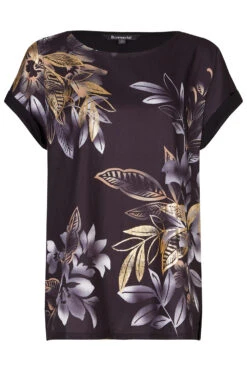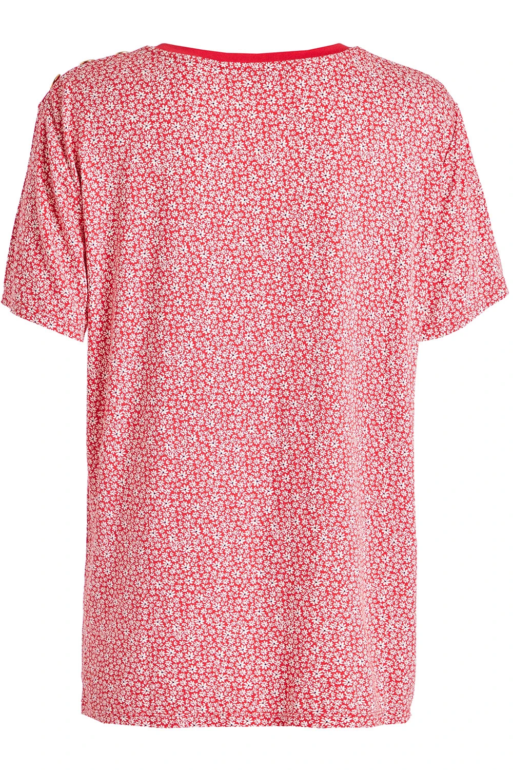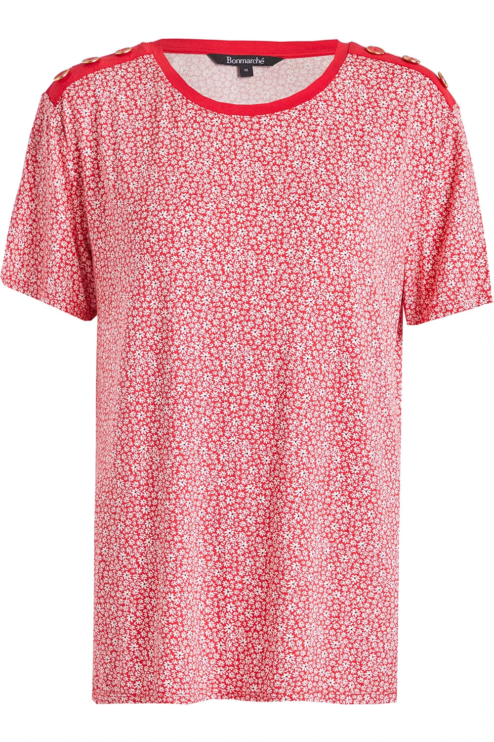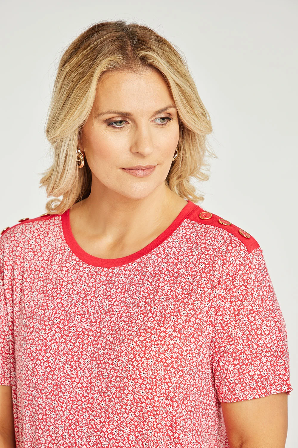 This top is a great twist on a classic style. The small ditsy flower print is subtle but adds a feminine touch to the piece. The round neck and short sleeves make the top more breathable and comfortable. Finished off with a button detail on the shoulders to keep it stylish. Pair with jeans and boots for a smart casual look.