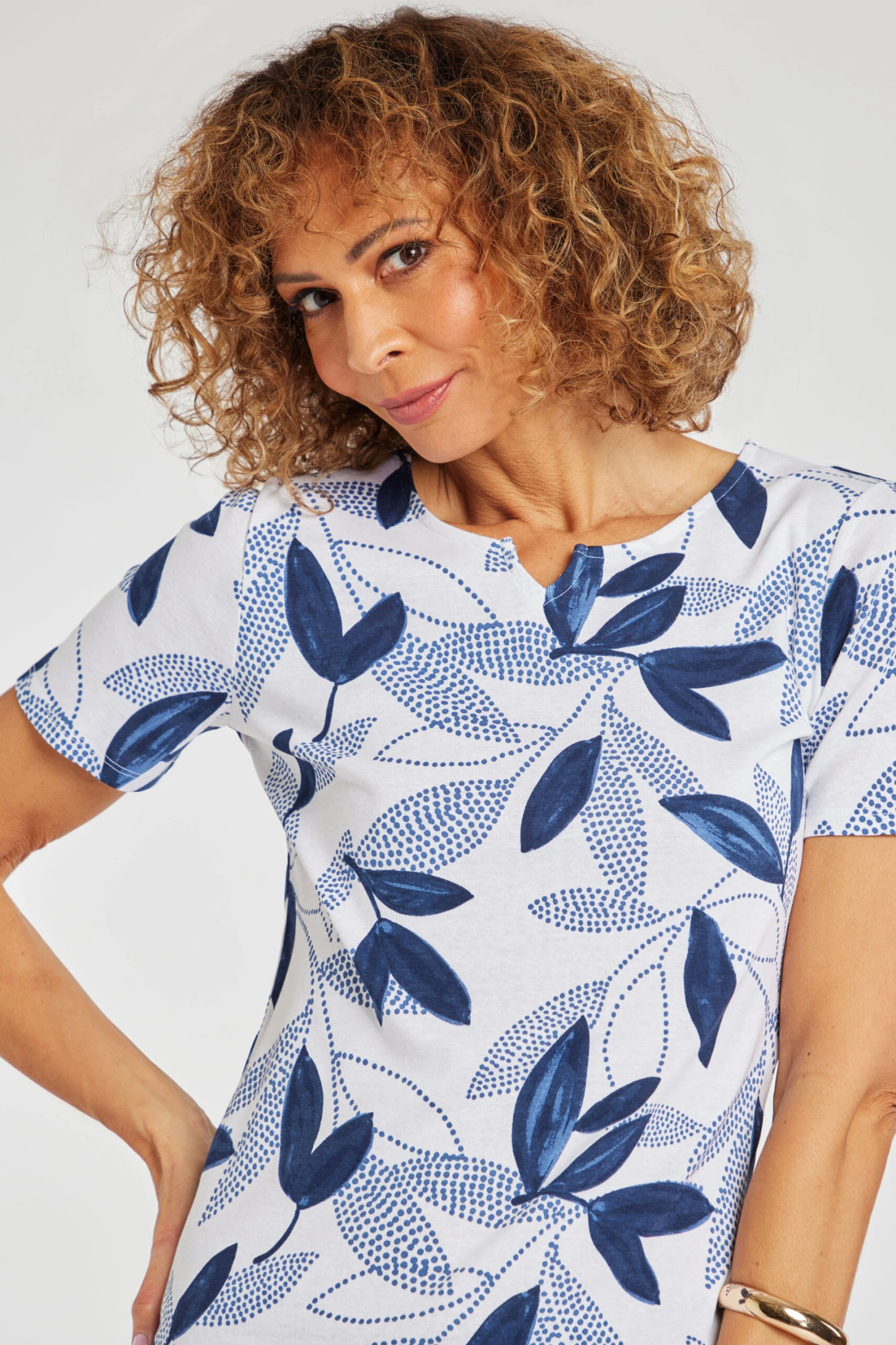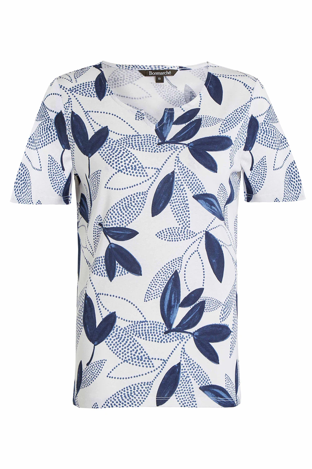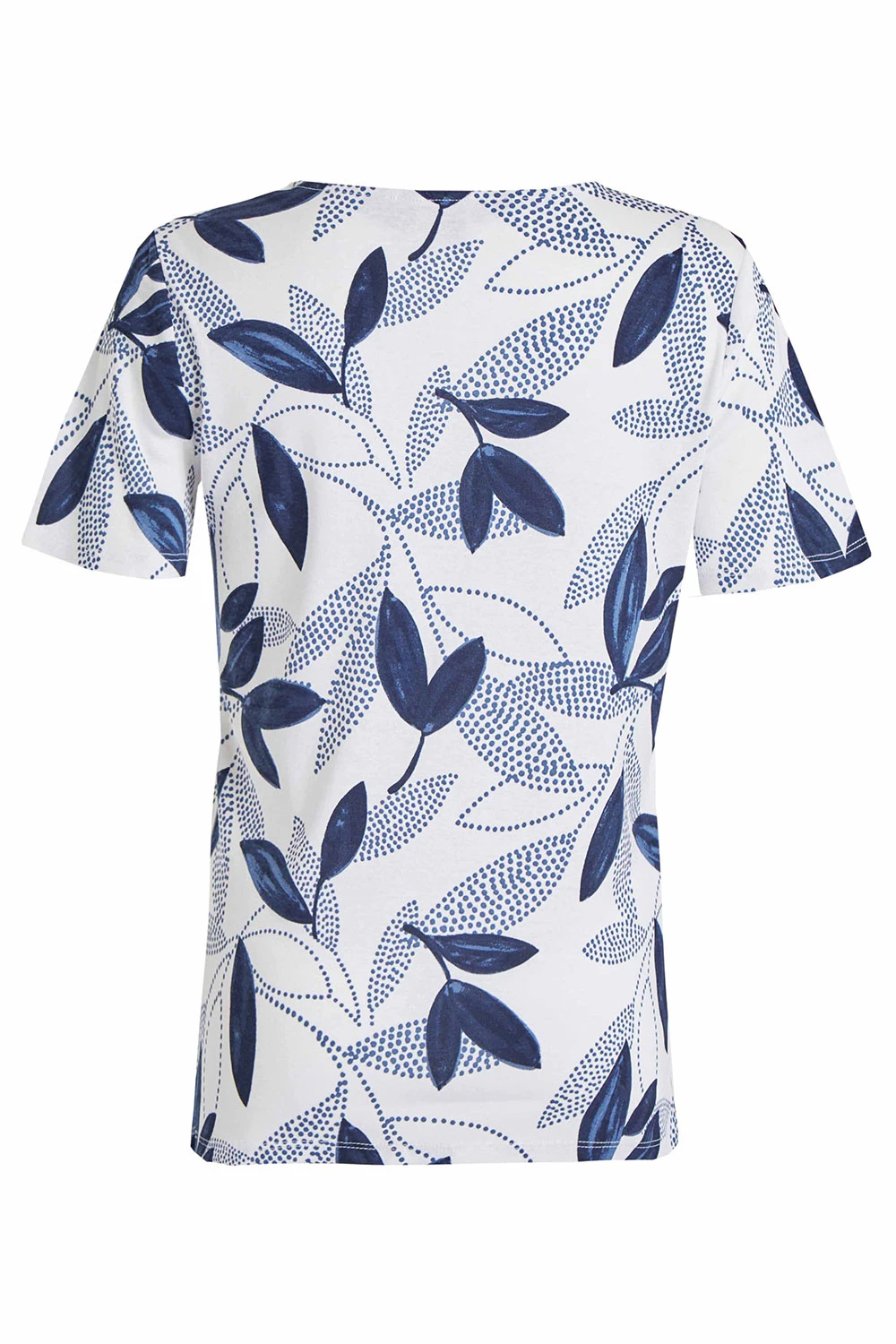 This short sleeve top is perfect for springtime. The leaves and dot print make it feel like spring and warmth. Complete with short sleeves and a notch neck to make it breathable and comfortable. Pair with your favourite jeans and trainers for a casual look.