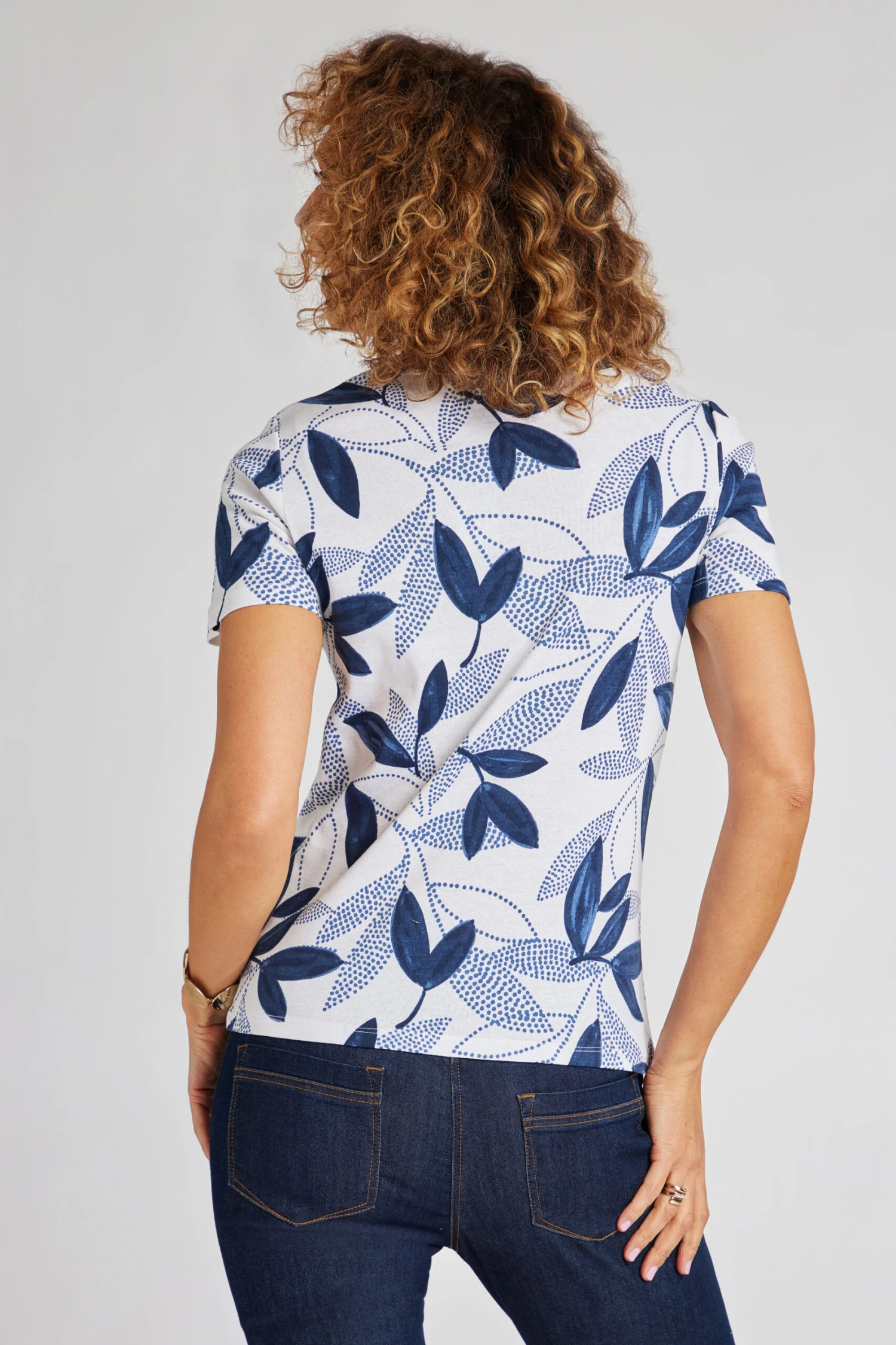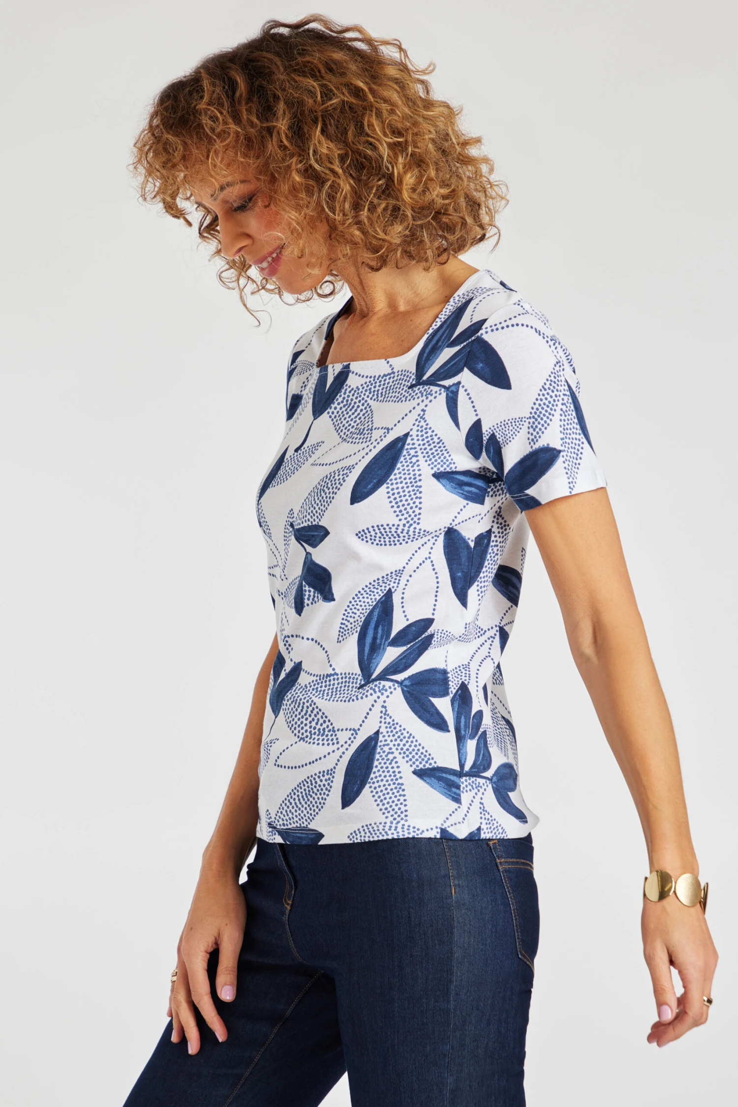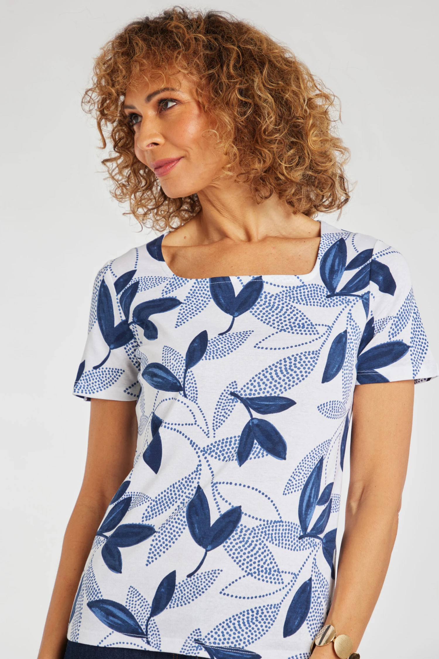 This short sleeve top is perfect for springtime. The leaves and dot print make it feel like spring and warmth. Complete with short sleeves and a square neck to make it breathable and comfortable. Pair with your favourite jeans and trainers for a casual look.