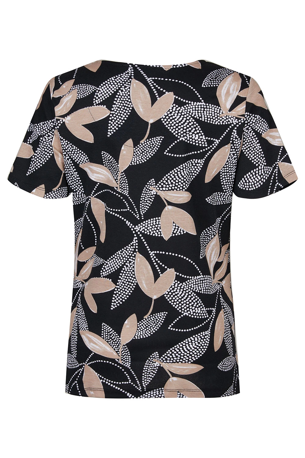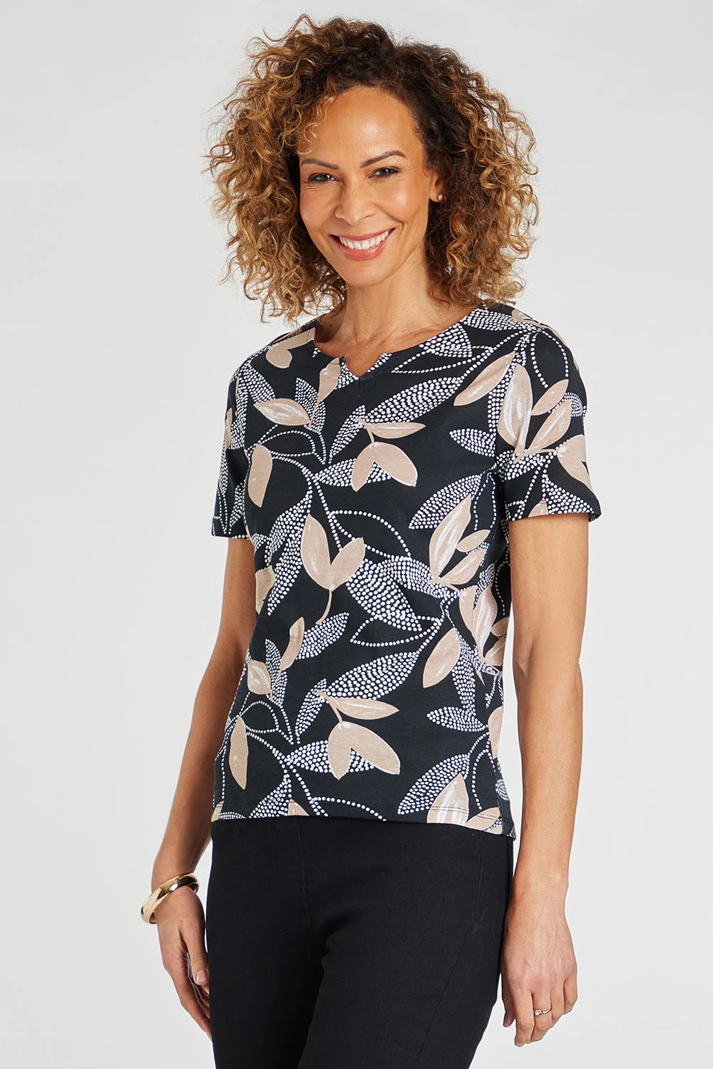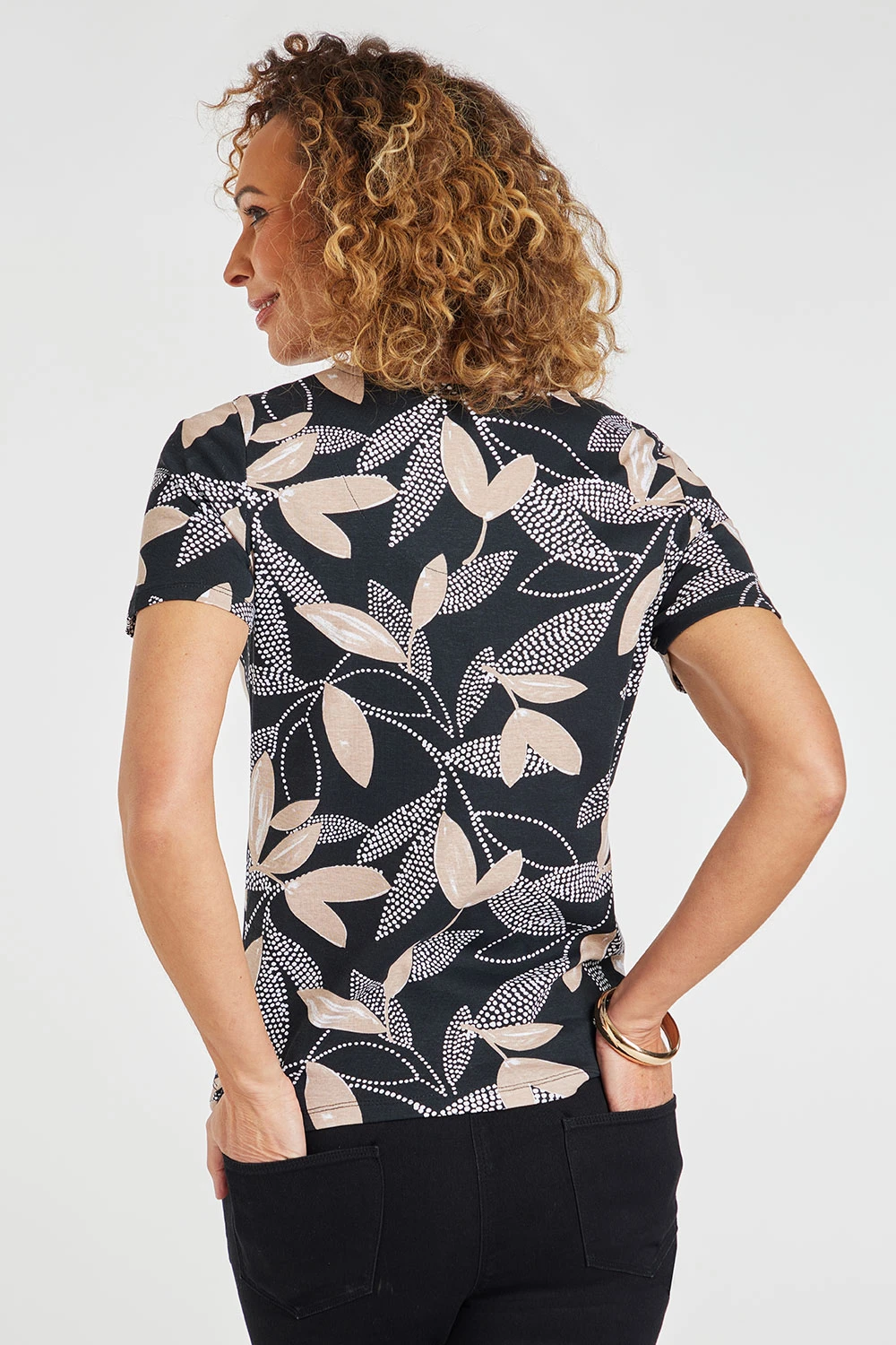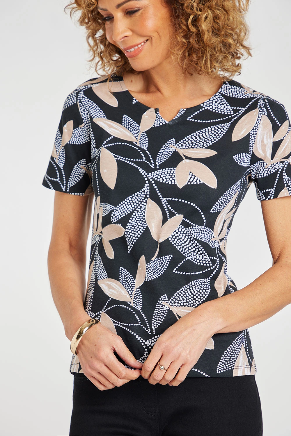 This short sleeve top is perfect for springtime. The leaves and dot print make it feel like spring and warmth. Complete with short sleeves and a notch neck to make it breathable and comfortable. Pair with your favourite jeans and trainers for a casual look.