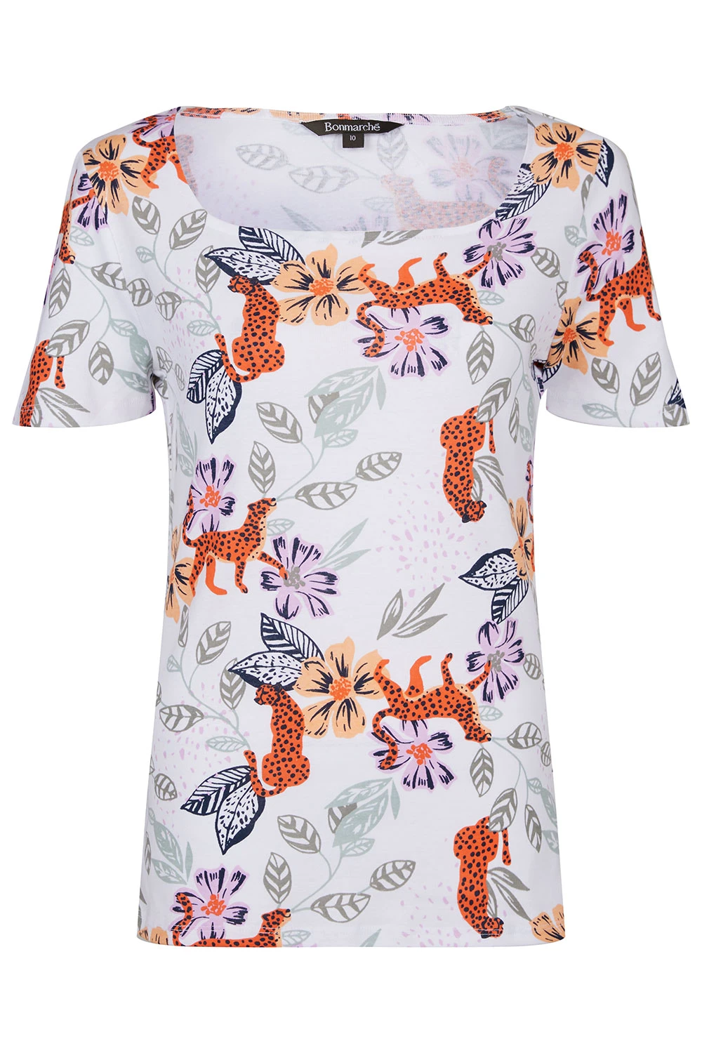 Add this floral top to your collection this Spring. The leopard print and floral design are a great twist on a classic top. Complete with short sleeves and a square neckline makes it perfect for the warmer months ahead. Pair with white trousers and sandals for a casual summer look.