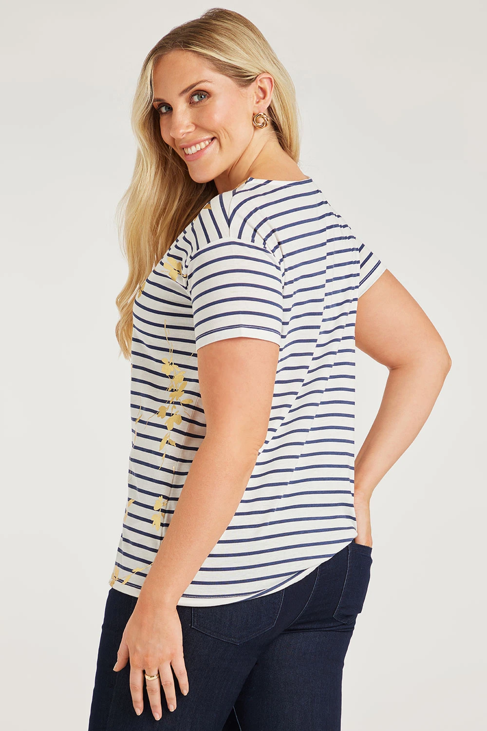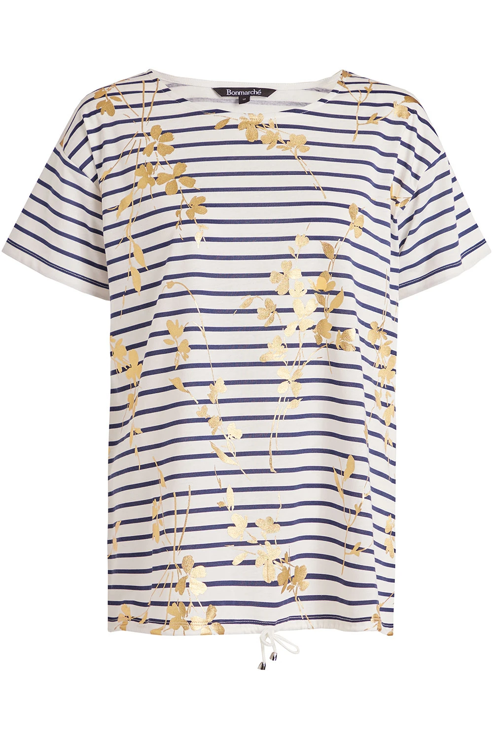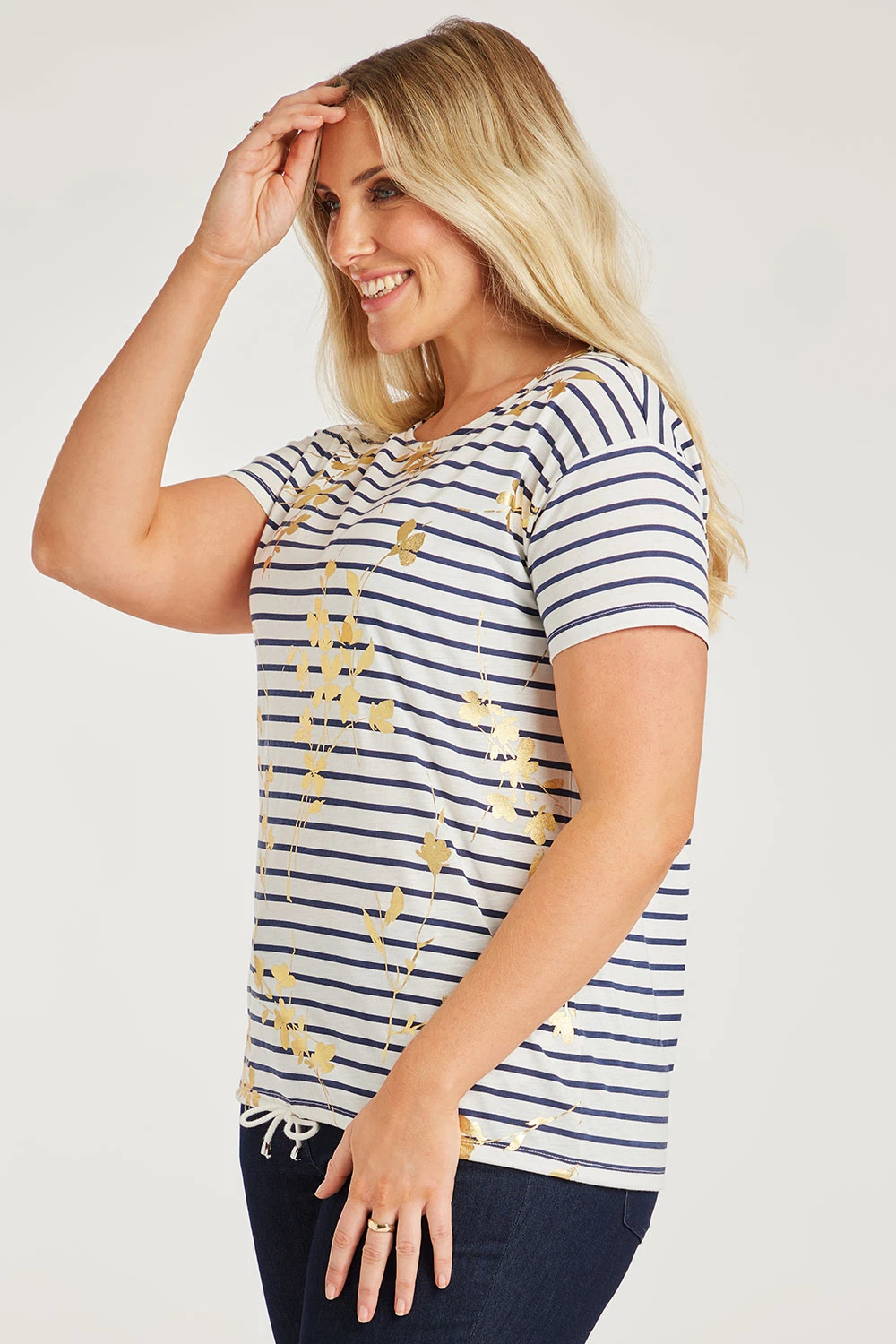 The foil floral top is perfect for a casual springtime outfit. The stripes paired with the floral foil overlay make it stand out and easy to style with items you may have in your wardrobe. The short sleeves and drawstring hem make it comfortable and breathable for when it gets warmer.