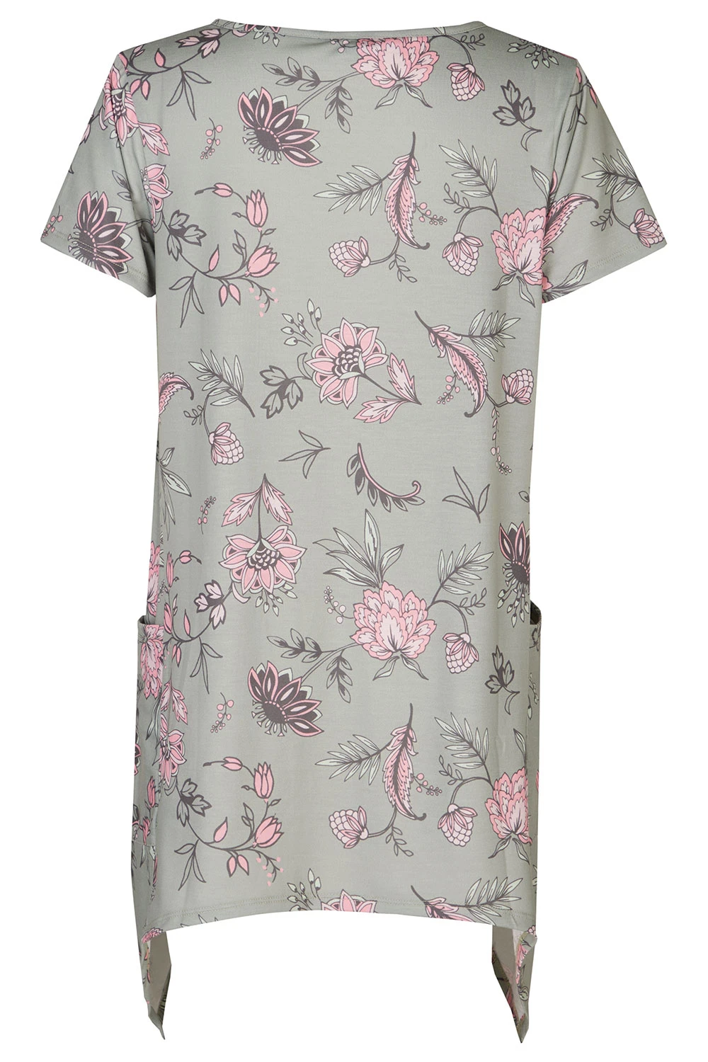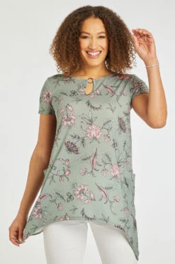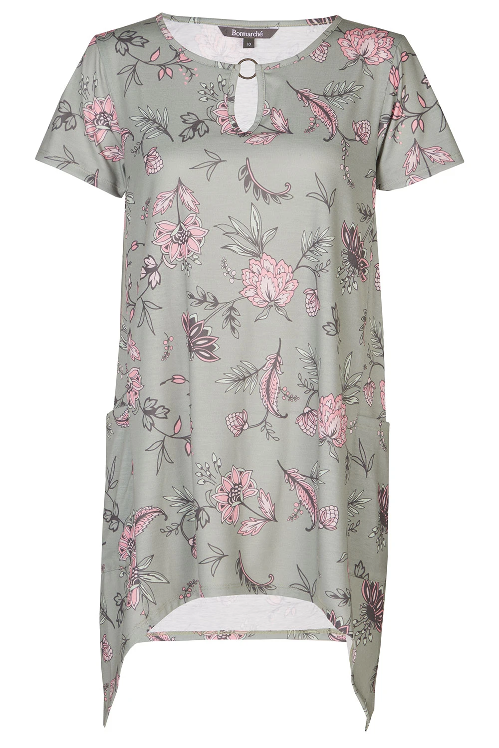 This short sleeve floral tunic is a must have for your wardrobe this season. The beautifully designed floral print paired with the pocket detail makes this a statement piece. Complete with a metal ring detail on the neckline and a hanky hemline for a great twist on a classic tunic.