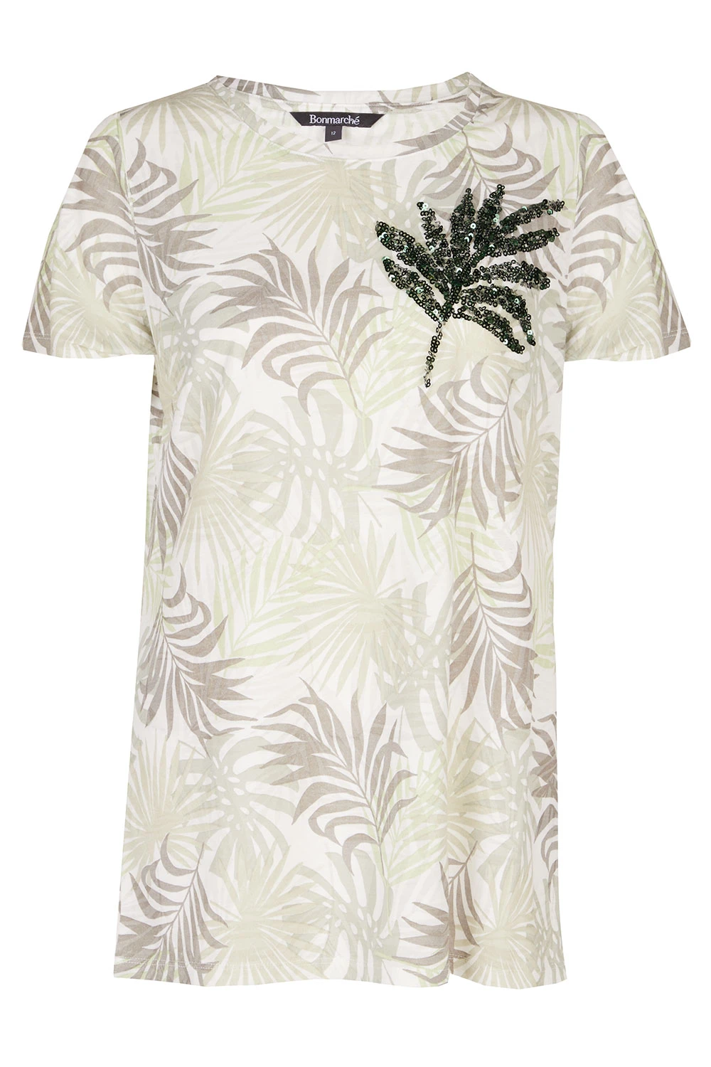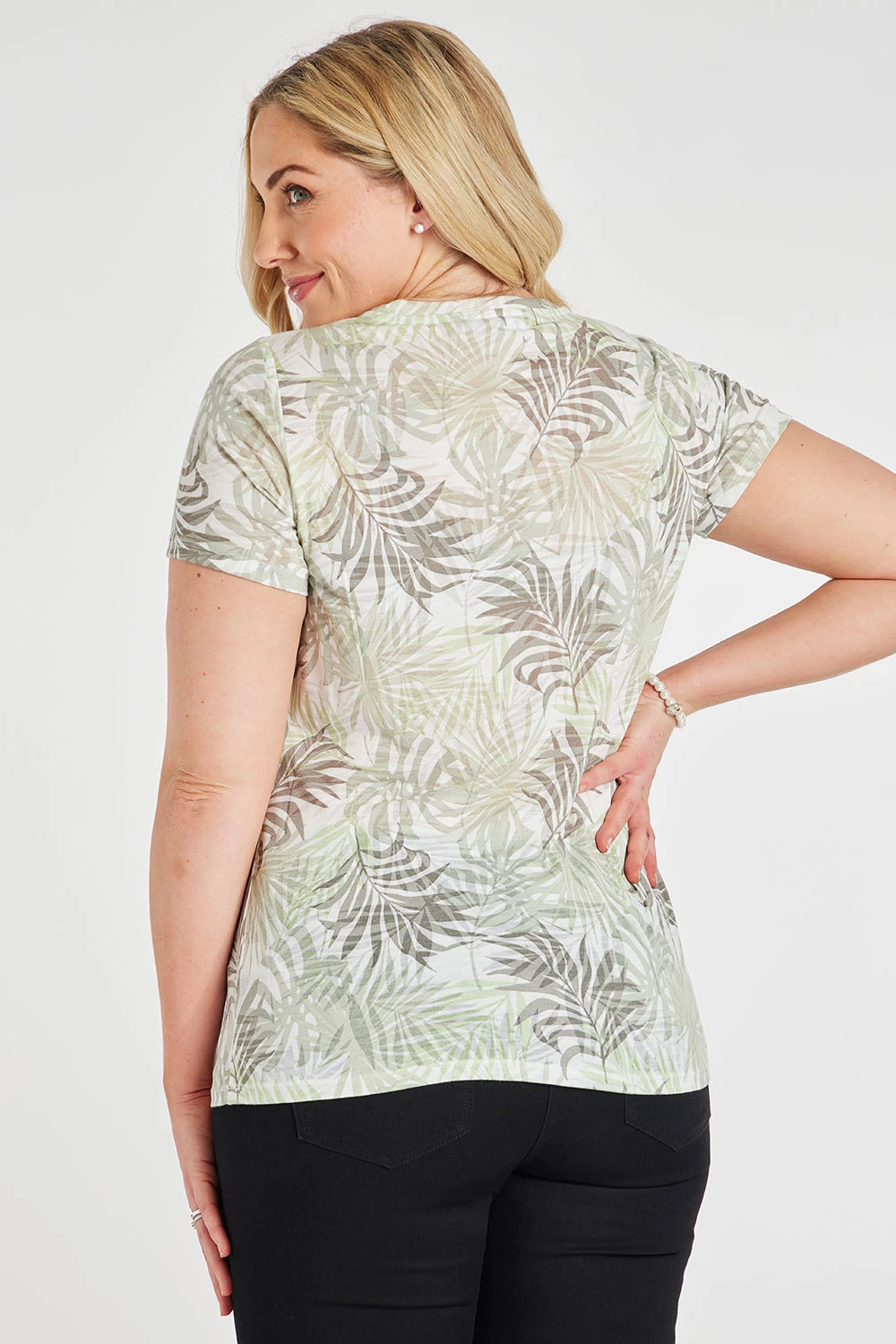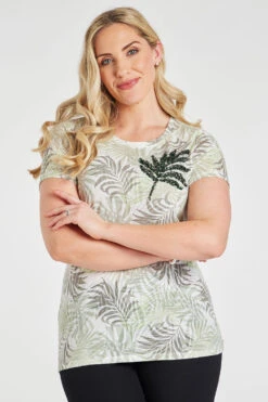 This charming leaf print T-shirt gives your casual wear a quick refresh. It is made from a comfortable fabric and as the fabric is naturally breathable, this piece works well on hot days as well as cold. The round neckline and short sleeves create a modern silhouette. Slip this piece on with leggings, a cardigan, and boots when enjoying a laid-back weekend.