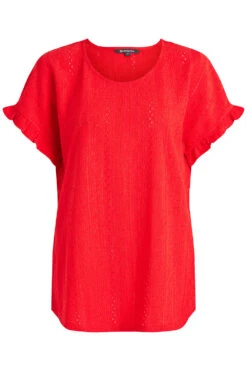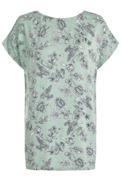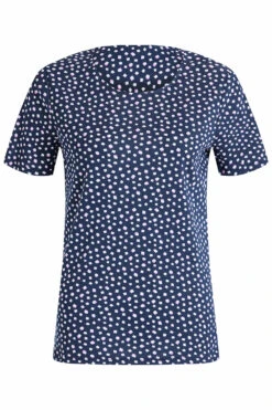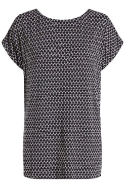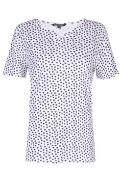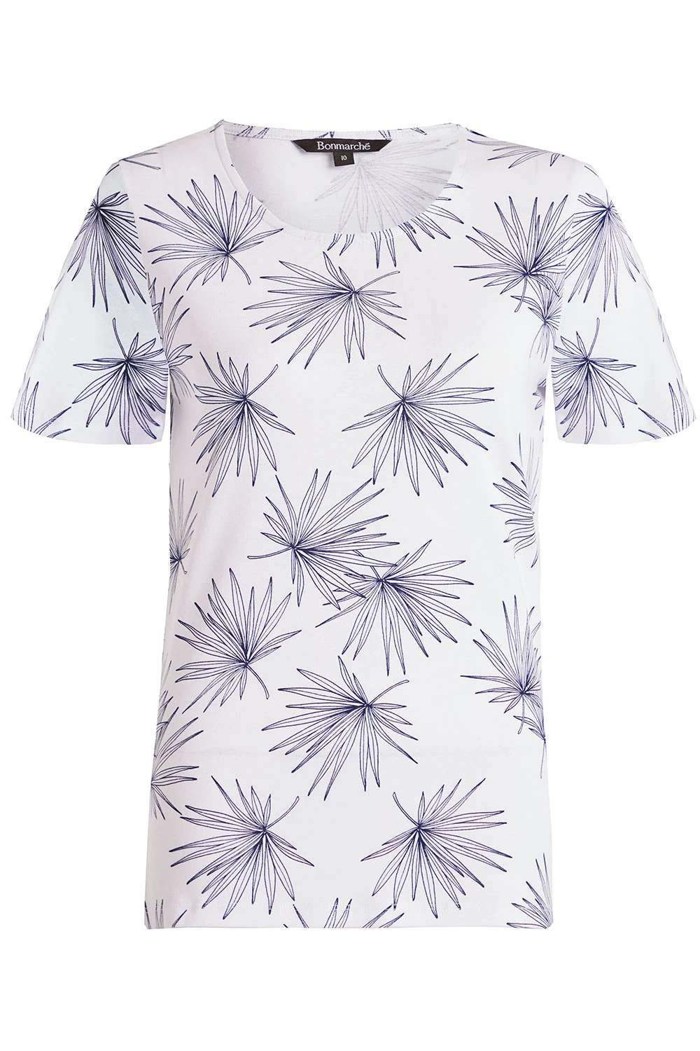 This all-over fan print is a lovely addition to any wardrobe. The cotton material will make it breathable and comfortable for the warmer months. Short sleeves and a scoop neck will make it a great piece for any season. Pair with jeans and boots for a casual weekend outfit.