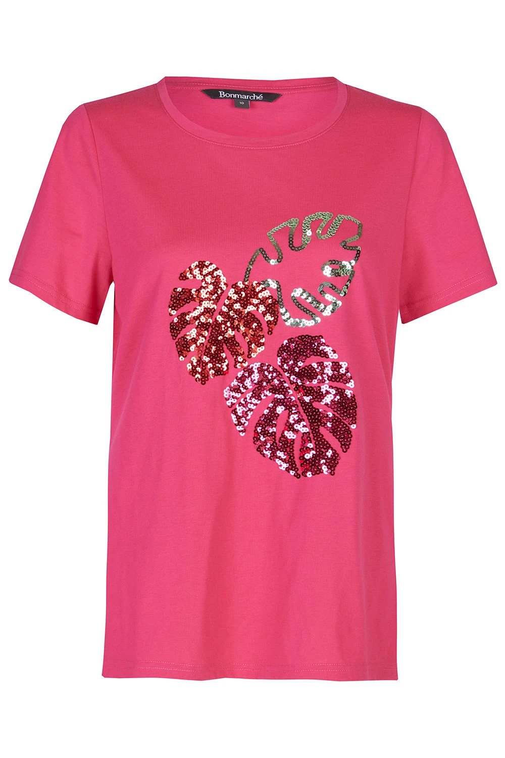 This short sleeve t-shirt is perfect for the Summer time. The sequin leaves make it a statement piece. Complete with short sleeves and a round neckline to make it breathable and comfortable. Pair with your favourite jeans and trainers for a casual look.