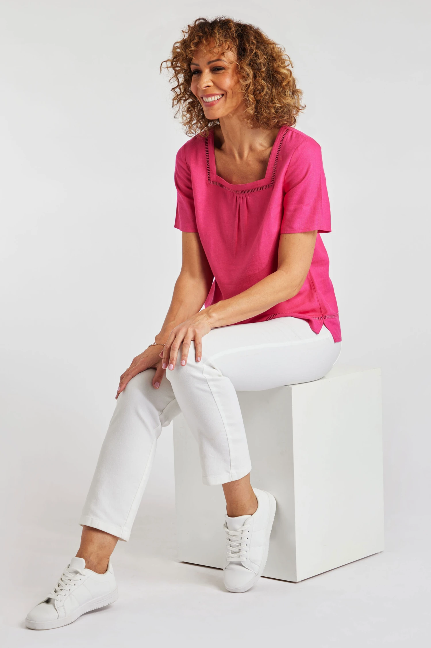 This short sleeve linen top is a must-have this season. It can be dressed up with a bold skirt and sandals or paired with knee-high boots and a denim jacket for a smart casual look. A great item handpicked by Lorraine Kelly. The plain design and colour make it a great piece to style.