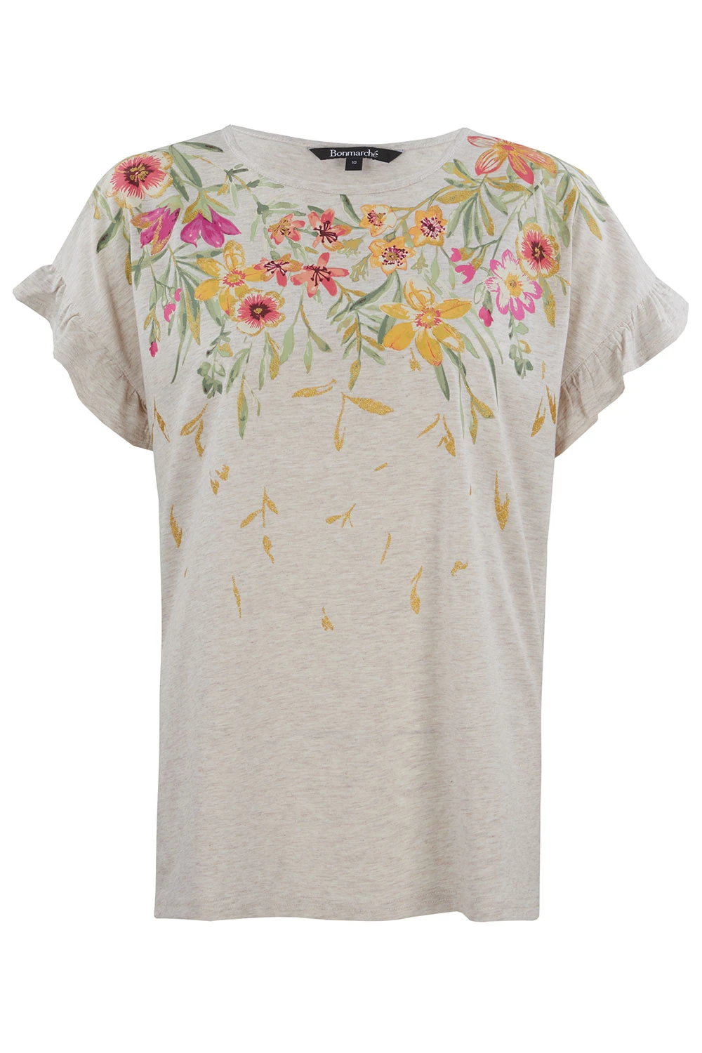 This short sleeve, round neck t-shirt features a trailing floral print around the neckline and frill detail. The perfect t-shirt to wear on holiday with shorts or cropped trousers to complete the look.