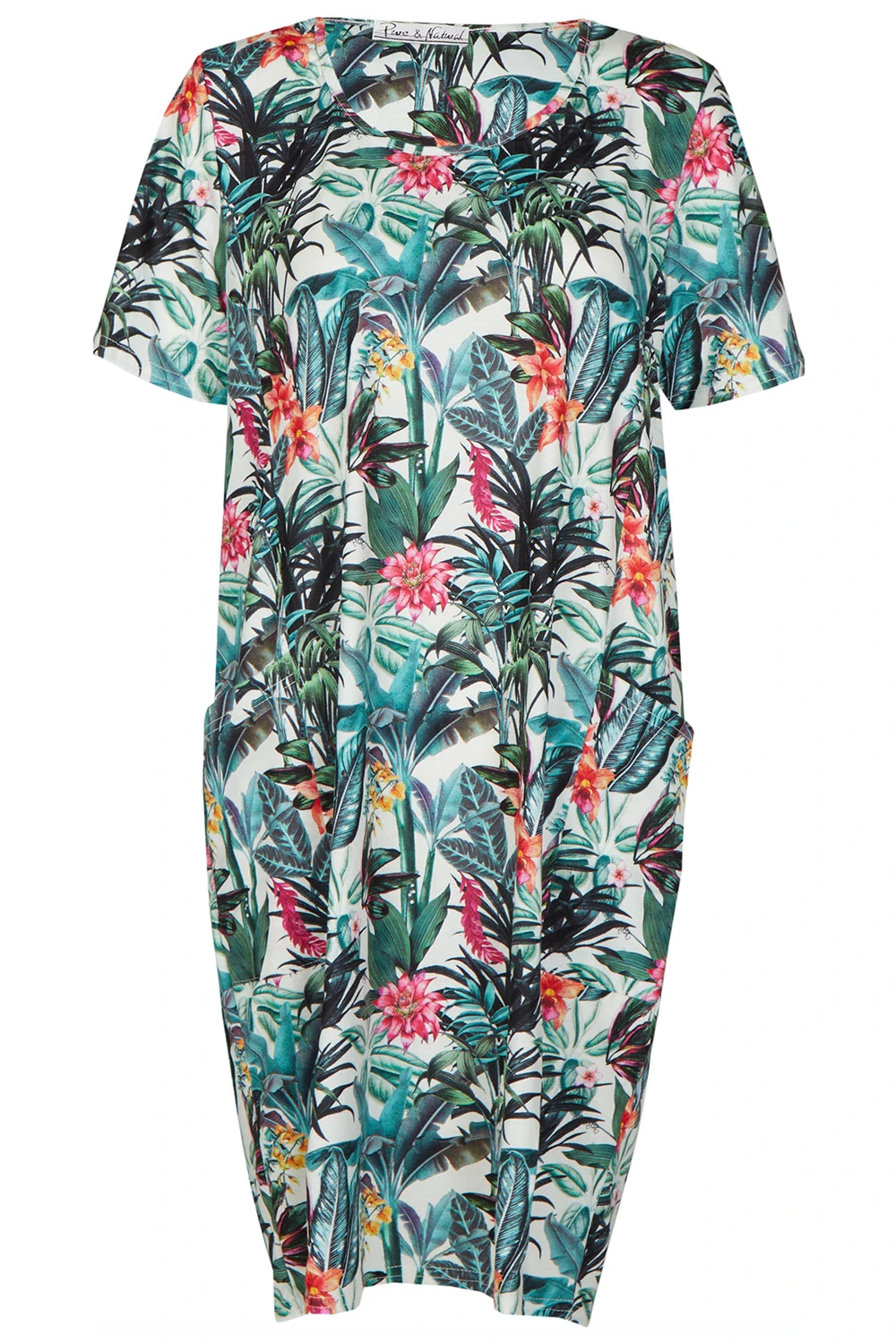 Add this short sleeve, printed dress to your collection this Summer. The beautifully designed tropical print against the green background paired with the breathable and comfortable fabric makes it a must-have this season. Pair with heeled boots and a light jacket for a great going out look.