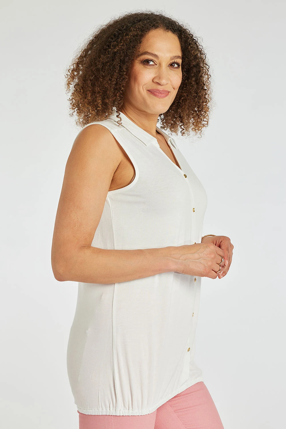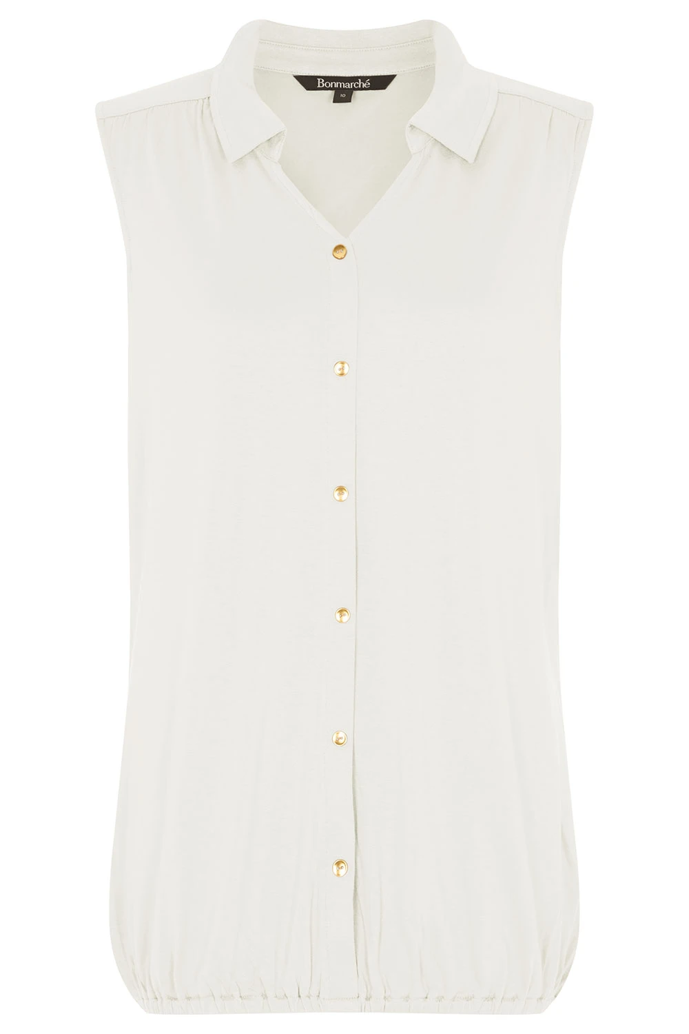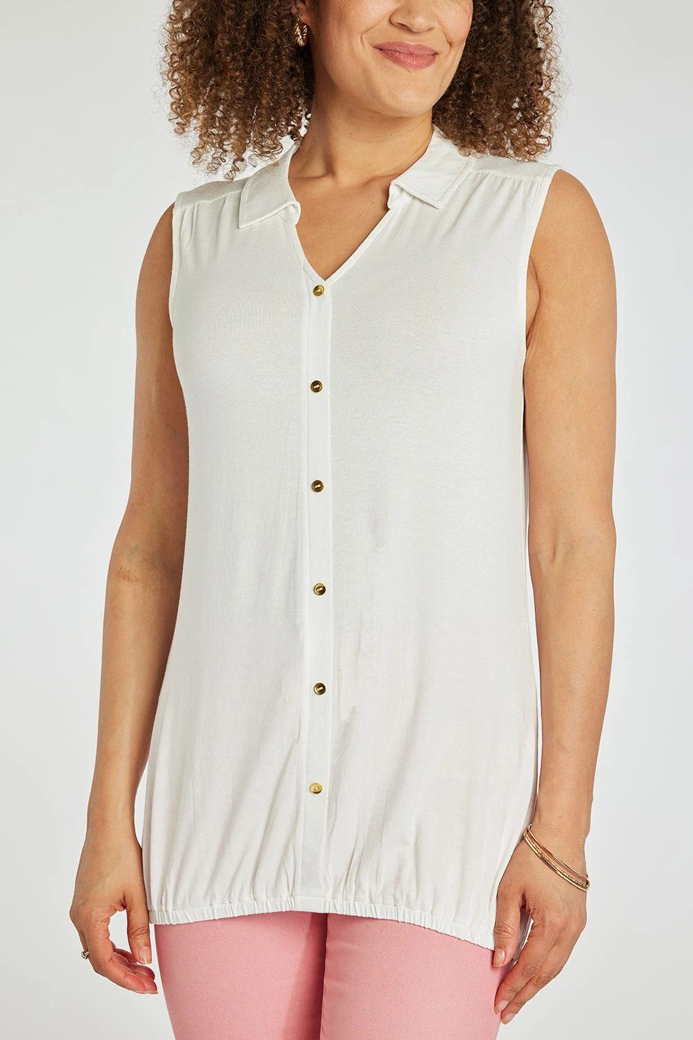 This stylish, easy to wear bubble hem shirt is a must-have for your wardrobe this season. With a button through design and sleeveless look, it is comfortable yet fashionable. Wear it with your favourite jeggings or jeans to complete the look.