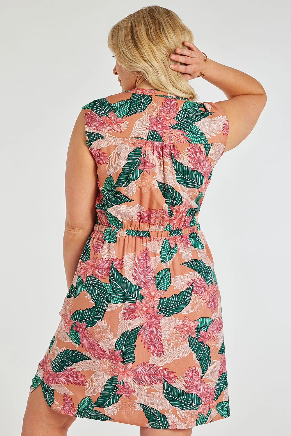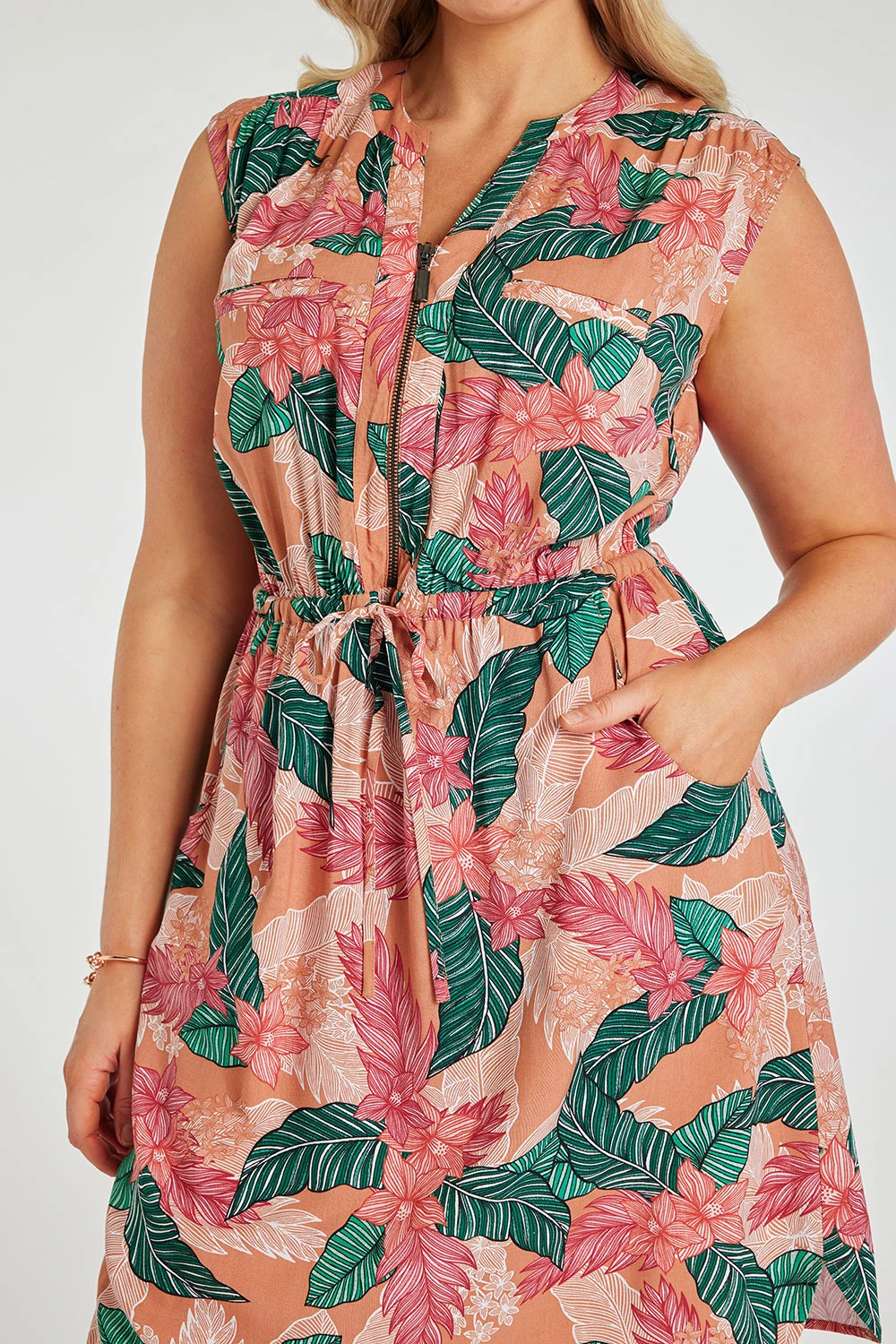 Be bold this season with this beautifully designed tropical flower woven dress. Complete with a sleeveless design and zip front to make it comfortable and breathable in the hotter months. Wear with sandals and a small handbag for a great holiday look.