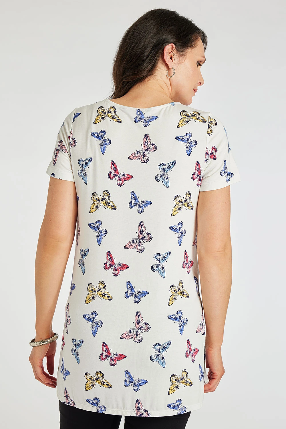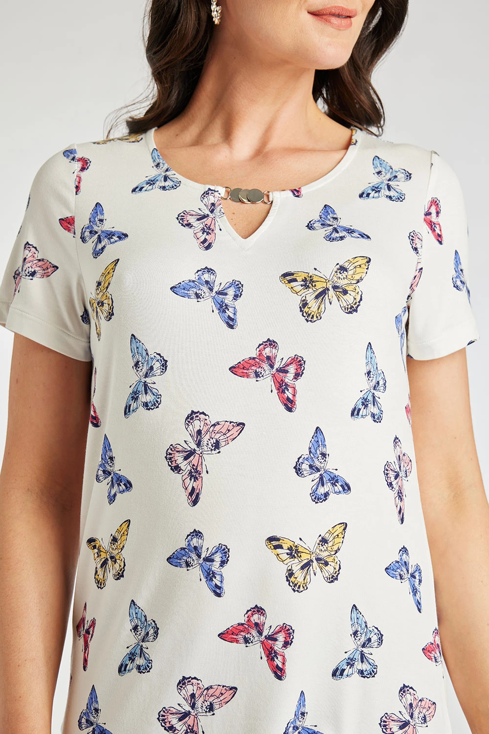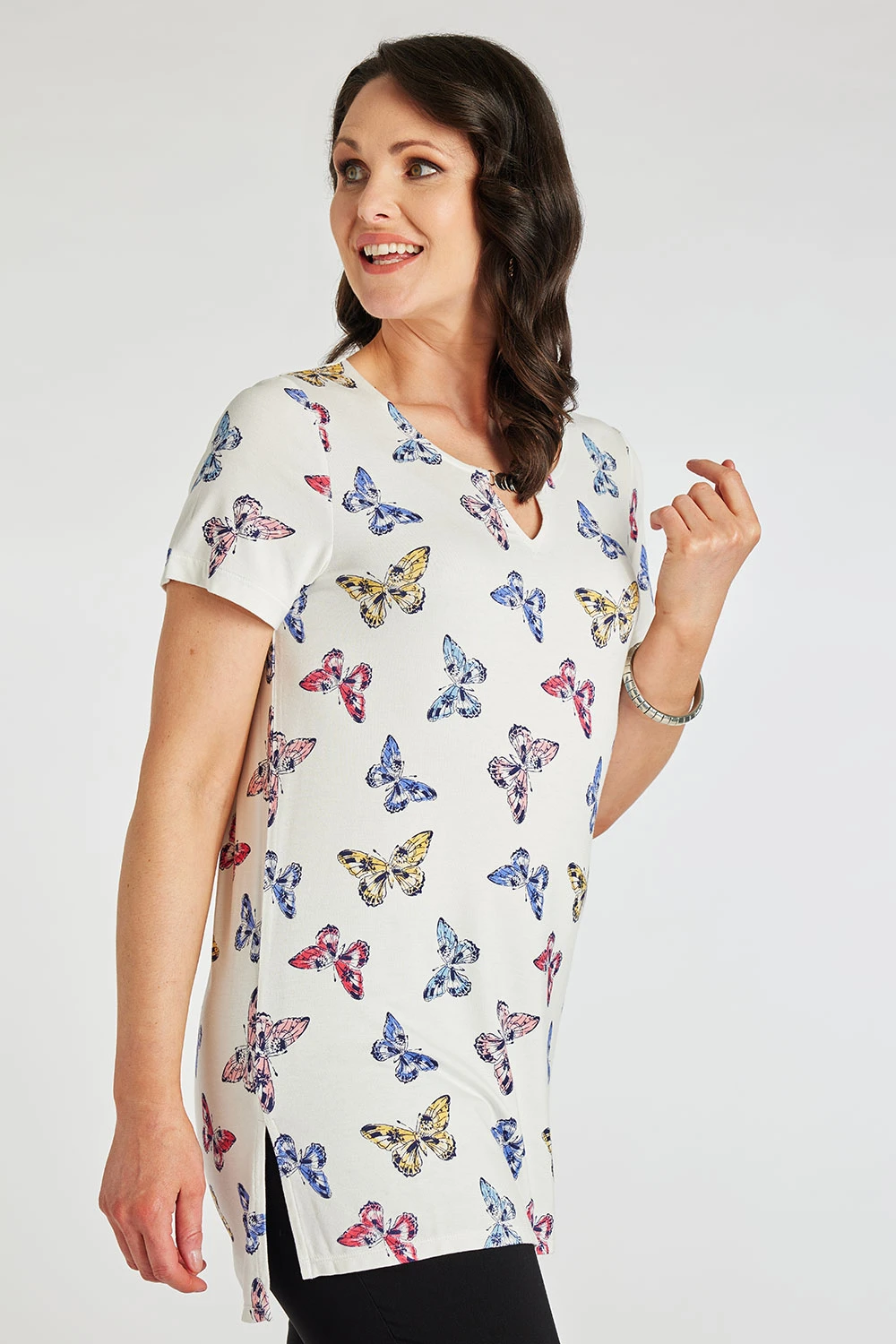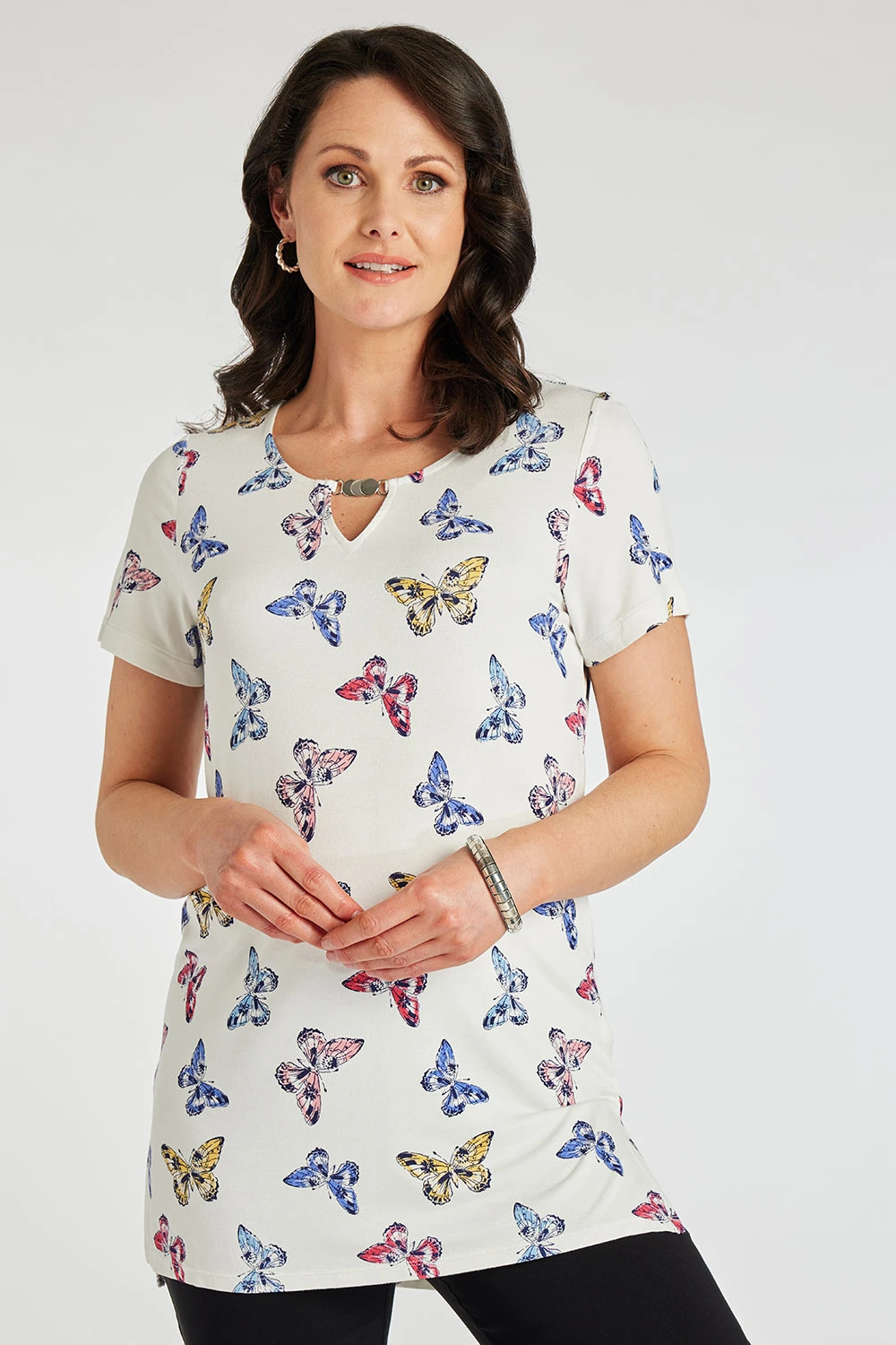 Get ready for Summer with this spaced butterfly print tunic. Complete with short sleeves and keyhole detail to keep it comfortable and fashionable. Wear with leggings or cropped trousers for a great casual holiday look.