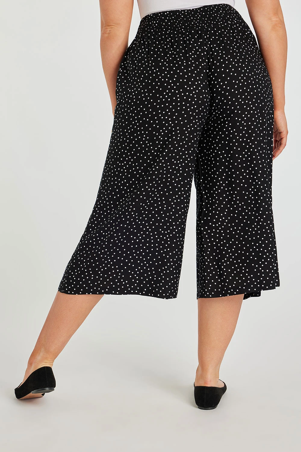 Brighten up your wardrobe with these spot print trousers in a modern cropped cut. Their breathable fabric and easy fit will keep you comfy and cool during the summer months. An elasticated back panel gives them a flattering silhouette. We have finished them off with handy pockets at the front and decorative button detailing.