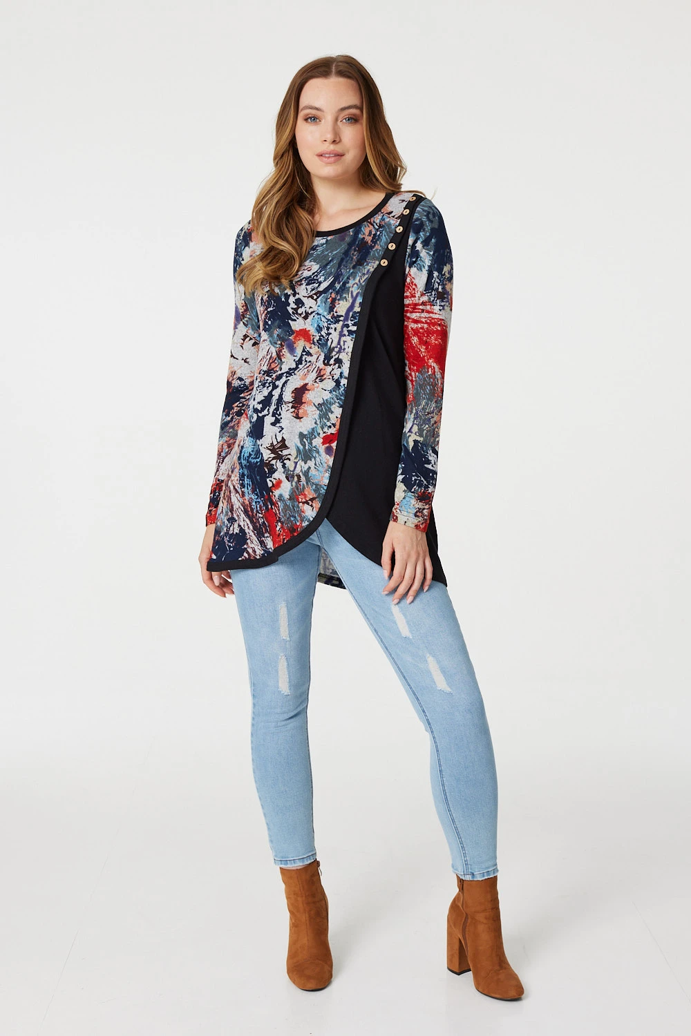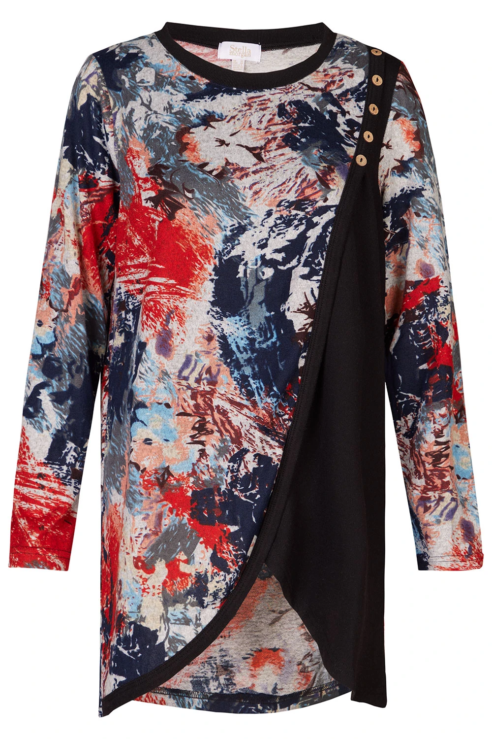 STELLA MORGAN | Stand out this season with this beautifully designed long sleeve tunic. Complete with a wrap over the shoulder design and button detail. Pair with light jeans and heeled boots for a smart casual outfit.