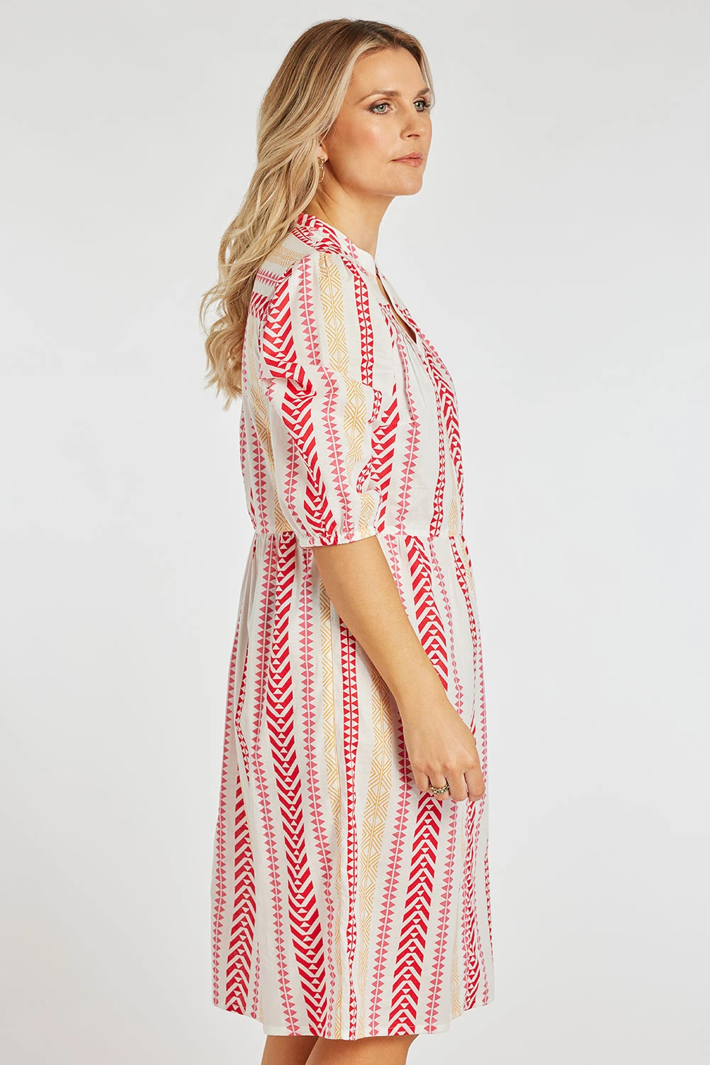 Feel Summery with this Striped Jacquard Print Dress. The colour scheme is perfect for the Summer paired with the V-neckline to keep it cool during hotter days. Pair with sandals and a light jacket for the perfect weekend out look.